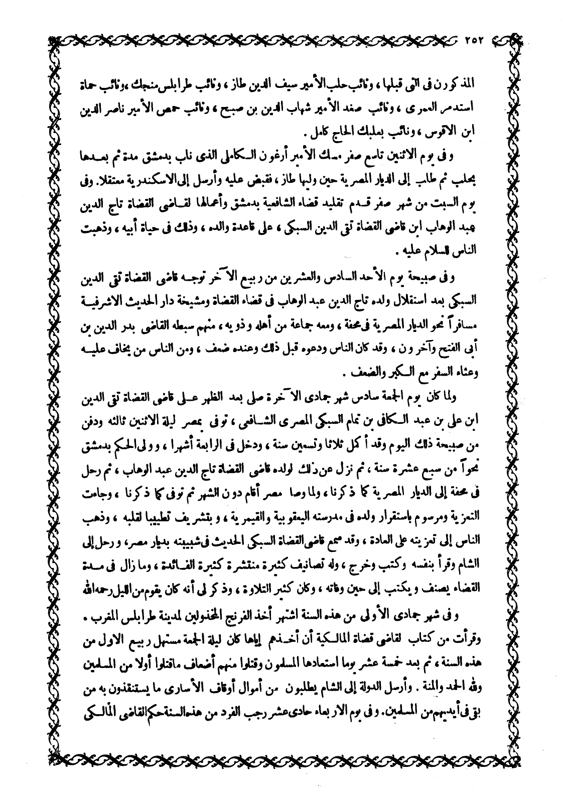 ولما كان يوم الجمعة سادس شهر جمادى الآخرة صلى بعد الظهر على قاضى القضاة تقى الدين ابن عَلِيِّ بْنِ عَبْدِ الْكَافِي بْنِ تَمَامٍ السُّبْكِيِّ الْمِصْرِيِّ الشَّافِعِيِّ، تُوُفِّيَ بِمِصْرَ لَيْلَةَ الِاثْنَيْنِ ثَالِثَهُ وَدُفِنَ مِنْ صَبِيحَةِ ذَلِكَ الْيَوْمِ وَقَدْ أَكْمَلَ ثلاثا وتسعين سَنَةً، وَدَخَلَ فِي الرَّابِعَةِ أَشْهُرًا، وَوَلِيَ الْحُكْمَ بِدِمَشْقَ نَحْوًا مِنْ سَبْعَ عَشْرَةَ سَنَةً، ثُمَّ نَزَلَ عَنْ ذَلِكَ لِوَلَدِهِ قَاضِي الْقُضَاةِ تَاجِ الدِّينِ عَبْدِ الْوَهَّابِ، ثُمَّ رَحَلَ فِي مِحَفَّةٍ إِلَى الدِّيَارِ الْمِصْرِيَّةِ كَمَا ذَكَرْنَا، وَلَمَّا وَصَلَ مِصْرَ أَقَامَ دُونَ الشَّهْرِ ثُمَّ تُوُفِّيَ كَمَا ذَكَرْنَا، وَجَاءَتِ التَّعْزِيَةُ وَمَرْسُومٌ بِاسْتِقْرَارِ وَلَدِهِ فِي مَدْرَسَتِهِ الْيَعْقُوبِيَّةِ وَالْقَيْمَرِيَّةِ، وَبِتَشْرِيفٍ تَطْيِيبًا لِقَلْبِهِ، وَذَهَبَ النَّاسُ إِلَى تَعْزِيَتِهِ عَلَى الْعَادَةِ، وَقَدْ سَمِعَ قَاضِي الْقُضَاةِ السُّبْكِيُّ الْحَدِيثَ فِي شَبِيبَتِهِ بِدِيَارِ مِصْرَ، وَرَحَلَ إِلَى الشَّامِ وَقَرَأَ بِنَفْسِهِ وَكَتَبَ وَخَرَّجَ، وَلَهُ تَصَانِيفُ كَثِيرَةٌ مُنْتَشِرَةٌ كَثِيرَةُ الْفَائِدَةِ، وَمَا زَالَ فِي مُدَّةِ الْقَضَاءِ يُصَنِّفُ وَيَكْتُبُ إِلَى حِينِ وَفَاتِهِ، وَكَانَ كَثِيرَ التِّلَاوَةِ، وَذُكِرَ لِي أَنَّهُ كَانَ يَقُومُ مِنَ اللَّيْلِ رَحِمَهُ اللَّهُ وَفِي شَهْرِ جُمَادَى الْأُولَى مِنْ هَذِهِ السَّنَةِ اشْتُهِرَ أَخْذُ الْفِرَنْجِ الْمَخْذُولِينَ لِمَدِينَةِ طَرَابُلُسَ الْمَغْرِبِ، وَقَرَأَتُ مِنْ كِتَابٍ لِقَاضِي قُضَاةِ الْمَالِكِيَّةِ أَنَّ أَخْذَهُمْ إِيَّاهَا كَانَ لَيْلَةَ الْجُمُعَةِ مُسْتَهَلِّ رَبِيعٍ الْأَوَّلِ مِنْ هَذِهِ السَّنَةِ، ثُمَّ بَعْدَ خَمْسَةَ عَشَرَ يَوْمًا اسْتَعَادَهَا الْمُسْلِمُونَ وَقَتَلُوا مِنْهُمْ أَضْعَافَ مَا قَتَلُوا أَوَّلًا مِنَ الْمُسْلِمِينَ وللَّه الْحَمْدُ وَالْمِنَّةُ. وَأَرْسَلَ الدَّوْلَةُ إِلَى الشَّامِ يَطْلُبُونَ مِنْ أَمْوَالِ أَوْقَافِ الْأُسَارَى مَا يَسْتَنْقِذُونَ بِهِ مَنْ بَقِيَ فِي أَيْدِيهِمْ مِنَ الْمُسْلِمِينَ. وَفِي يَوْمِ الْأَرْبِعَاءِ حَادِيَ عَشَرَ رَجَبٍ الْفَرْدِ مِنْ هَذِهِ السَّنَةِ حَكَمَ الْقَاضِي الْمَالِكِيُّ