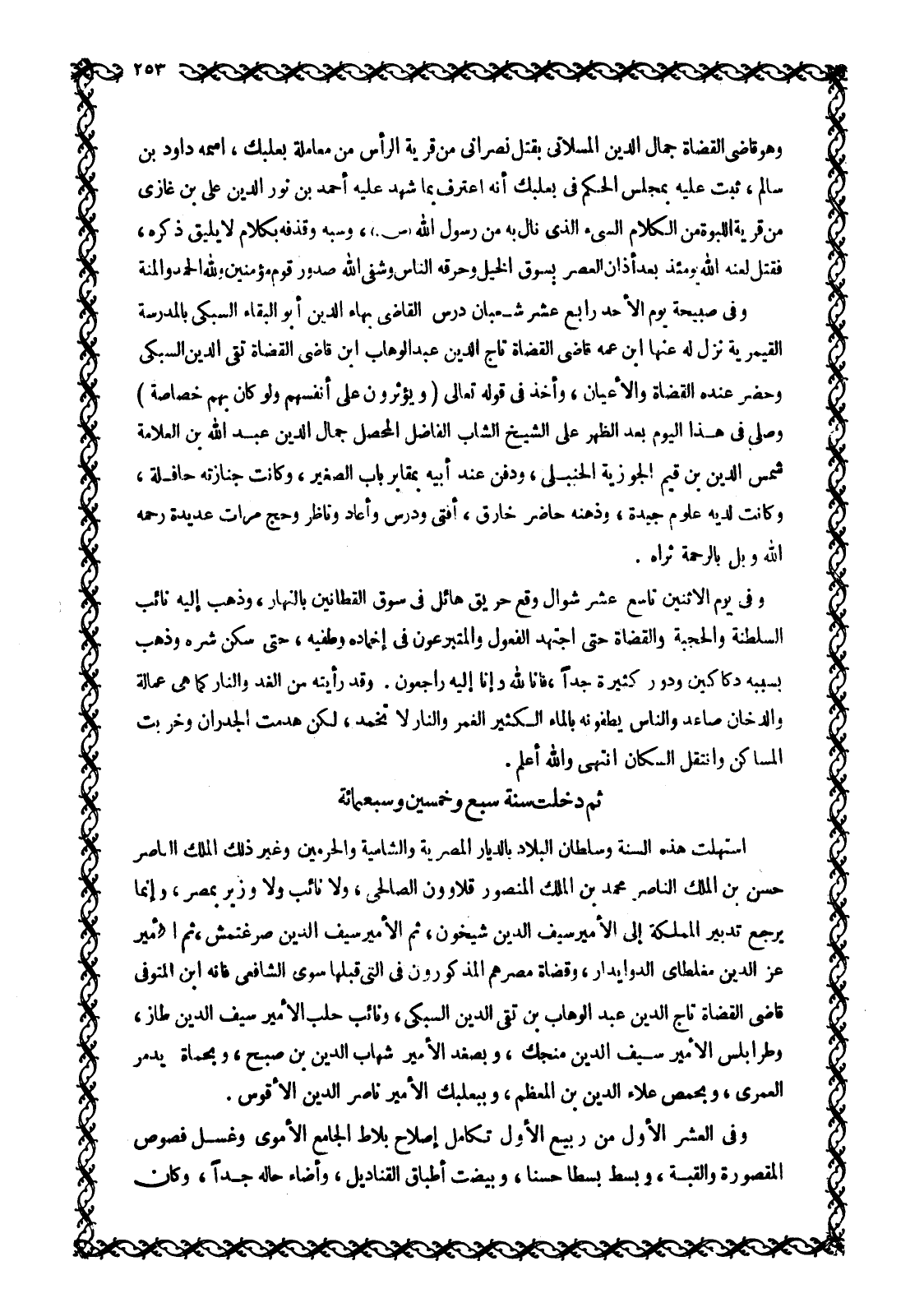 وَهُوَ قَاضِي الْقُضَاةِ جَمَالُ الدِّينِ الْمَسَلَّاتِيُّ بِقَتْلِ نَصْرَانِيٍّ مِنْ قَرْيَةِ الرَّأْسِ مِنْ مُعَامَلَةِ بَعْلَبَكَّ، اسْمُهُ دَاوُدُ بْنُ سَالِمٍ، ثَبَتَ عَلَيْهِ بِمَجْلِسِ الْحُكْمِ فِي بَعْلَبَكَّ أَنَّهُ اعْتَرَفَ بِمَا شَهِدَ عَلَيْهِ أَحْمَدُ بْنُ نُورِ الدِّينِ عَلِيُّ بْنُ غَازِي مِنْ قَرْيَةِ اللَّبْوَةِ مِنَ الْكَلَامِ السَّيِّئِ الَّذِي نَالَ بِهِ مِنْ رَسُولِ اللَّهِ صَلَّى اللَّهُ عَلَيْهِ وَسَلَّمَ، وَسَبَّهُ وَقَذَفَهُ بِكَلَامٍ لَا يَلِيقُ ذِكْرُهُ، فَقُتِلَ لَعَنَهُ اللَّهُ يَوْمَئِذٍ بَعْدَ أَذَانِ الْعَصْرِ بِسُوقِ الْخَيْلِ وَحَرَّقَهُ النَّاسُ وَشَفَى اللَّهُ صُدُورَ قَوْمٍ مُؤْمِنِينَ وللَّه الْحَمْدُ وَالْمِنَّةُ وَفِي صَبِيحَةِ يَوْمِ الْأَحَدِ رَابِعَ عَشَرَ شَعْبَانَ دَرَّسَ الْقَاضِي بَهَاءُ الدِّينِ أَبُو الْبَقَاءِ السُّبْكِيُّ بِالْمَدْرَسَةِ الْقَيْمَرِيَّةِ نَزَلَ لَهُ عَنْهَا ابْنُ عَمِّهِ قَاضِي الْقُضَاةِ تَاجُ الدين عبد الوهاب ابن قاضي القضاة تقي الدين السبكى وَحَضَرَ عِنْدَهُ الْقُضَاةُ وَالْأَعْيَانُ، وَأَخَذَ فِي قَوْلِهِ تَعَالَى وَيُؤْثِرُونَ عَلى أَنْفُسِهِمْ وَلَوْ كانَ بِهِمْ خَصاصَةٌ 59: 9 وصلى في هذا اليوم بعد الظهر عَلَى الشَّيْخِ الشَّابِّ الْفَاضِلِ الْمُحَصِّلِ جَمَالِ الدِّينِ عبد الله بن الْعَلَّامَةِ شَمْسِ الدِّينِ بْنِ قَيِّمِ الْجَوْزِيَّةِ الْحَنْبَلِيِّ، وَدُفِنَ عِنْدَ أَبِيهِ بِمَقَابِرَ بَابِ الصَّغِيرِ، وَكَانَتْ جَنَازَتُهُ حَافِلَةً، وَكَانَتْ لَدَيْهِ عُلُومٌ جَيِّدَةٌ، وَذِهْنُهُ حَاضِرٌ خَارِقٌ، أَفْتَى وَدَرَّسَ وَأَعَادَ وَنَاظَرَ وَحَجَّ مَرَّاتٍ عَدِيدَةً رَحِمَهُ اللَّهُ وَبَلَّ بِالرَّحْمَةِ ثَرَاهُ.