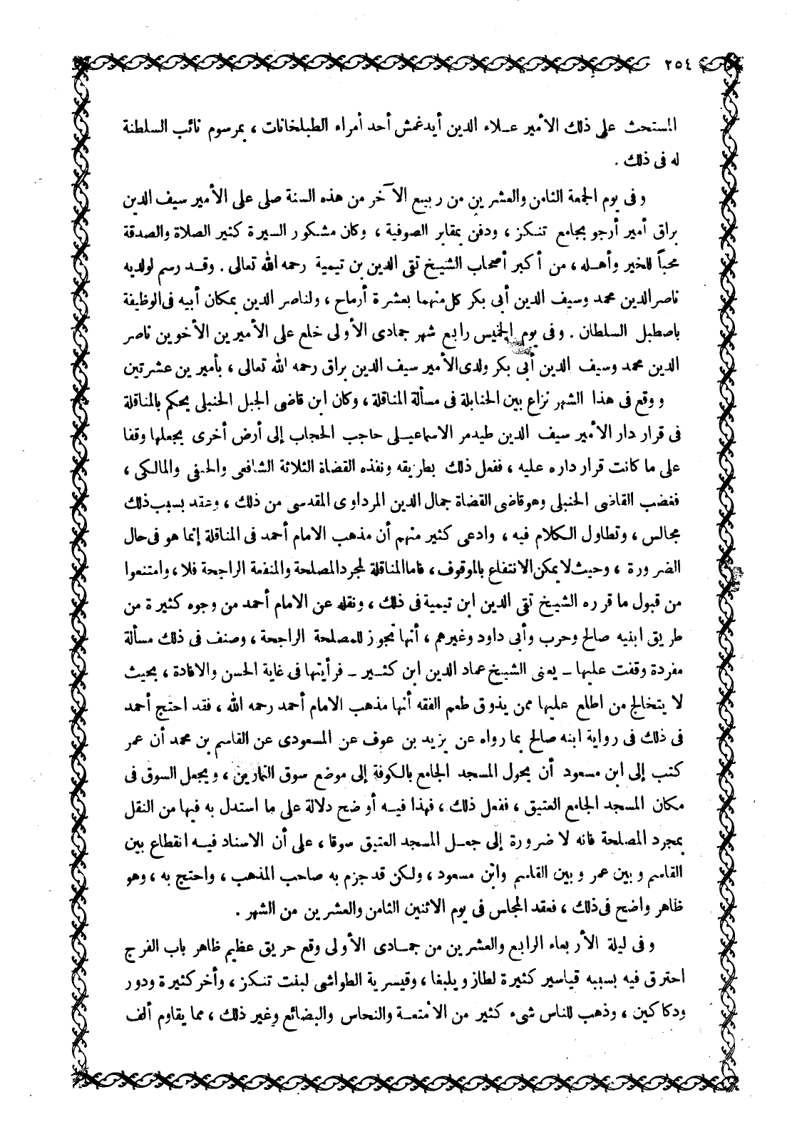 وَفِي يَوْمِ الْجُمُعَةِ الثَّامِنِ وَالْعِشْرِينَ مِنْ رَبِيعٍ الْآخِرِ مِنْ هَذِهِ السَّنَةِ صُلِّي عَلَى الْأَمِيرِ سَيْفِ الدين براق أمير أرجو بِجَامِعِ تَنْكِزَ، وَدُفِنَ بِمَقَابِرِ الصُّوفِيَّةِ، وَكَانَ مَشْكُورَ السِّيرَةِ كَثِيرَ الصَّلَاةِ وَالصَّدَقَةِ مُحِبًّا لِلْخَيْرِ وَأَهْلِهِ، من أكبر أصحاب الشيخ تقى الدين بن تَيْمِيَّةَ رَحِمَهُ اللَّهُ تَعَالَى. وَقَدْ رُسِمَ لِوَلَدَيْهِ نَاصِرِ الدِّينِ مُحَمَّدٍ وَسَيْفِ الدِّينِ أَبِي بَكْرٍ كُلٍّ مِنْهُمَا بِعَشَرَةِ أَرْمَاحٍ، وَلِنَاصِرِ الدِّينِ بِمَكَانِ أَبِيهِ فِي الْوَظِيفَةِ بِإِصْطَبْلِ السُّلْطَانِ. وَفِي يَوْمِ الْخَمِيسِ رَابِعِ شَهْرِ جُمَادَى الْأُولَى خُلِعَ عَلَى الْأَمِيرَيْنِ الْأَخَوَيْنِ نَاصِرِ الدِّينِ مُحَمَّدٍ وَسَيْفِ الدِّينِ أَبِي بَكْرٍ وَلَدَيِ الْأَمِيرِ سَيْفِ الدِّينِ بُرَاقٍ رَحِمَهُ اللَّهُ تَعَالَى، بِأَمِيرَيْنِ عَشَرَتَيْنِ وَوَقَعَ فِي هَذَا الشَّهْرِ نِزَاعٌ بَيْنَ الْحَنَابِلَةِ فِي مَسْأَلَةِ المناقلة، وكان ابن قاضى الجبل الحنبلي يَحْكُمَ بِالْمُنَاقَلَةِ فِي قَرَارِ دَارِ الْأَمِيرِ سَيْفِ الدِّينِ طَيْدَمُرَ الْإِسْمَاعِيلِيِّ حَاجِبِ الْحُجَّابِ إِلَى أَرْضٍ أُخْرَى يَجْعَلُهَا وَقْفًا عَلَى مَا كَانَتْ قَرَارُ دَارِهِ عَلَيْهِ، فَفَعَلَ ذَلِكَ بِطَرِيقِهِ وَنَفَّذَهُ الْقُضَاةُ الثَّلَاثَةُ الشَّافِعِيُّ وَالْحَنَفِيُّ وَالْمَالِكِيُّ، فَغَضِبَ الْقَاضِي الْحَنْبَلِيُّ وَهُوَ قَاضِي الْقُضَاةِ جَمَالُ الدِّينِ الْمَرْدَاوِيُّ الْمَقْدِسِيُّ مِنْ ذَلِكَ، وَعَقْدَ بِسَبَبِ ذَلِكَ مَجَالِسَ، وَتَطَاوُلَ الْكَلَامُ فِيهِ، وَادَّعَى كَثِيرٌ مِنْهُمْ أَنَّ مَذْهَبَ الْإِمَامِ أَحْمَدَ فِي الْمُنَاقَلَةِ إِنَّمَا هُوَ فِي حَالِ الضَّرُورَةِ، وَحَيْثُ لَا يُمْكِنُ الِانْتِفَاعُ بِالْمَوْقُوفِ، فَأَمَّا الْمُنَاقَلَةُ لِمُجَرَّدِ الْمُصْلَحَةِ وَالْمَنْفَعَةِ الرَّاجِحَةِ فَلَا، وَامْتَنَعُوا مِنْ قَبُولِ مَا قَرَّرَهُ الشَّيْخُ تَقِيُّ الدِّينِ ابْنُ تَيْمِيَّةَ فِي ذَلِكَ، وَنَقَلَهُ عَنِ الْإِمَامِ أَحْمَدَ مِنْ وُجُوهٍ كَثِيرَةٍ مِنْ طَرِيقِ ابنيه صَالِحٍ وَحَرْبٍ وَأَبِي دَاوُدَ وَغَيْرِهِمْ، أَنَّهَا تَجُوزُ لِلْمَصْلَحَةِ الرَّاجِحَةِ، وَصَنَّفَ فِي ذَلِكَ مَسْأَلَةً مُفْرَدَةً وقفت عليها- يعنى الشيخ عماد الدين ابن كثير- فَرَأَيْتُهَا فِي غَايَةِ الْحُسْنِ وَالْإِفَادَةِ، بِحَيْثُ لَا يَتَخَالَجُ مَنِ اطَّلَعَ عَلَيْهَا مِمَّنْ يَذُوقُ طَعْمَ الْفِقْهِ أَنَّهَا مَذْهَبُ الْإِمَامِ أَحْمَدَ رَحِمَهُ اللَّهُ، فَقَدِ احْتَجَّ أَحْمَدُ فِي ذَلِكَ فِي رِوَايَةِ ابْنِهِ صَالِحٍ بِمَا رَوَاهُ عَنْ يَزِيدَ بْنِ عوف عَنِ الْمَسْعُودِيِّ عَنِ الْقَاسِمِ بْنِ مُحَمَّدٍ أَنَّ عُمَرَ كَتَبَ إِلَى ابْنِ مَسْعُودٍ أَنْ يُحَوِّلَ الْمَسْجِدَ الْجَامِعَ بِالْكُوفَةِ إِلَى مَوْضِعِ سُوقِ التَّمَارِينَ، وَيَجْعَلَ السُّوقَ فِي مَكَانِ الْمَسْجِدِ الْجَامِعِ الْعَتِيقِ، فَفَعَلَ ذَلِكَ، فَهَذَا فِيهِ أَوْضَحُ دَلَالَةٍ عَلَى مَا اسْتَدَلَّ بِهِ فِيهَا مِنَ النَّقْلِ بِمُجَرَّدِ الْمُصْلِحَةِ فَإِنَّهُ لَا ضَرُورَةَ إِلَى جَعْلِ الْمَسْجِدِ الْعَتِيقِ سُوقًا، عَلَى أَنَّ الْإِسْنَادَ فِيهِ انْقِطَاعٌ بَيْنَ الْقَاسِمِ وَبَيْنَ عُمَرَ وَبَيْنَ الْقَاسِمِ وَابْنِ مَسْعُودٍ، وَلَكِنْ قَدْ جَزَمَ بِهِ صَاحِبُ الْمَذْهَبِ، وَاحْتَجَّ بِهِ، وَهُوَ ظَاهِرٌ وَاضِحٌ فِي ذَلِكَ، فَعُقِدَ الْمَجْلِسُ فِي يَوْمِ الِاثْنَيْنِ الثَّامِنِ وَالْعِشْرِينَ مِنَ الشَّهْرِ.