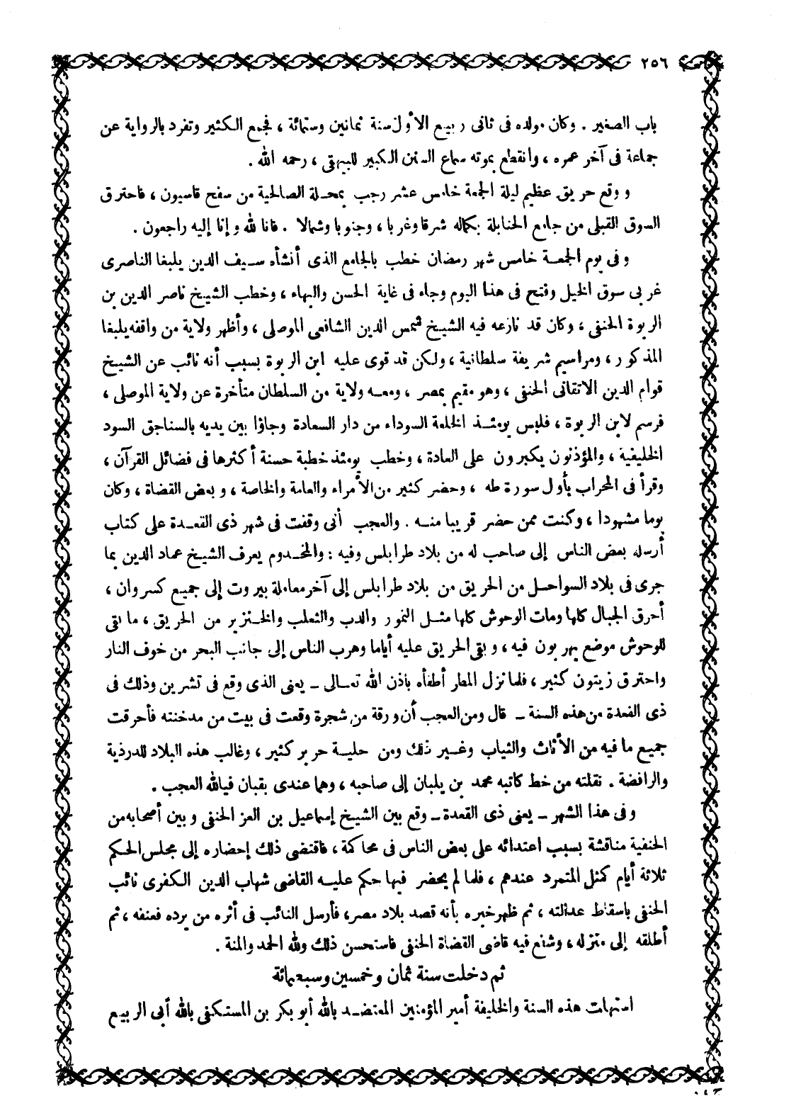 وَوَقَعَ حَرِيقٌ عَظِيمٌ لَيْلَةَ الْجُمُعَةِ خَامِسَ عَشَرَ رَجَبٍ بِمَحَلَّةِ الصَّالِحِيَّةِ مِنْ سَفْحِ قَاسِيُونَ، فَاحْتَرَقَ السُّوقُ الْقِبْلِيُّ مِنْ جَامِعِ الْحَنَابِلَةِ بِكَمَالِهِ شرقا وغربا، وجنوبا وشمالا، ف إِنَّا لِلَّهِ وَإِنَّا إِلَيْهِ راجِعُونَ. 2: 156 وَفِي يَوْمِ الْجُمُعَةِ خَامِسِ شَهْرِ رَمَضَانَ خُطِبَ بِالْجَامِعِ الَّذِي أَنْشَاهُ سَيْفُ الدِّينِ يَلْبُغَا النَّاصِرِيُّ غَرْبِيَّ سُوقِ الْخَيْلِ وَفُتِحَ فِي هَذَا الْيَوْمِ وَجَاءَ فِي غَايَةِ الْحُسْنِ وَالْبَهَاءِ، وَخَطَبَ الشَّيْخُ نَاصِرُ الدِّينِ بْنُ الرَّبْوَةِ الْحَنَفِيُّ، وَكَانَ قَدْ نَازَعَهُ فِيهِ الشَّيْخُ شَمْسُ الدِّينِ الشَّافِعِيُّ الْمَوْصِلَيُّ، وَأَظْهَرَ وِلَايَةً مِنْ وَاقِفِهِ يَلْبُغَا الْمَذْكُورِ، وَمَرَاسِيمَ شَرِيفَةً سُلْطَانِيَّةً، وَلَكِنْ قَدْ قَوِيَ عَلَيْهِ ابْنُ الرَّبْوَةِ بِسَبَبِ أَنَّهُ نَائِبٌ عَنِ الشَّيْخِ قَوَامِ الدِّينِ الْإِتْقَانِيِّ الْحَنَفِيِّ، وَهُوَ مُقِيمٌ بِمِصْرَ، وَمَعَهُ وِلَايَةٌ مِنَ السُّلْطَانِ مُتَأَخِّرَةٌ عَنْ وِلَايَةِ الْمَوْصِلِيِّ، فَرُسِمَ لِابْنِ الرَّبْوَةِ، فَلَبِسَ يَوْمَئِذٍ الْخِلْعَةَ السَّوْدَاءَ مِنْ دَارِ السَّعَادَةِ وجاءوا بين يديه بالسناجق السود الخليفية، وَالْمُؤَذِّنُونَ يُكَبِّرُونَ عَلَى الْعَادَةِ، وَخَطَبَ يَوْمَئِذٍ خُطْبَةً حَسَنَةً أَكْثَرُهَا فِي فَضَائِلِ الْقُرْآنِ، وَقَرَأَ فِي الْمِحْرَابِ بِأَوَّلِ سُورَةِ طَهَ، وَحَضَرَ كَثِيرٌ مِنَ الْأُمَرَاءِ وَالْعَامَّةِ وَالْخَاصَّةِ، وَبَعْضُ الْقُضَاةِ، وَكَانَ يَوْمًا مَشْهُودًا، وَكُنْتُ مِمَّنْ حَضَرَ قَرِيبًا مِنْهُ. وَالْعَجَبُ أَنِّي وَقَفْتُ فِي شَهْرِ ذِي الْقَعْدَةِ عَلَى كِتَابٍ أَرْسَلَهُ بَعْضُ النَّاسِ إِلَى صَاحِبٍ لَهُ مِنْ بِلَادِ طَرَابُلُسَ وَفِيهِ: وَالْمَخْدُومُ يُعَرِّفُ الشَّيْخَ عِمَادَ الدِّينِ بِمَا جَرَى فِي بِلَادِ السَّوَاحِلِ مِنَ الْحَرِيقِ مِنْ بِلَادِ طَرَابُلُسَ إِلَى آخِرِ مُعَامَلَةِ بَيْرُوتَ إِلَى جَمِيعِ كَسْرُوانَ، أَحْرَقَ الْجِبَالَ كُلَّهَا وَمَاتَ الْوُحُوشُ كُلُّهَا مِثْلَ النُّمُورِ وَالدُّبِّ وَالثَّعْلَبِ وَالْخِنْزِيرِ مِنَ الْحَرِيقِ، مَا بَقِيَ لِلْوُحُوشِ موضع يهربون فيه، وبقي الحريق عليه أياما وَهَرَبَ النَّاسُ إِلَى جَانِبِ الْبَحْرِ مِنْ خَوْفِ النَّارِ وَاحْتَرَقَ زَيْتُونٌ كَثِيرٌ، فَلَمَّا نَزَلَ الْمَطَرُ أطفأه باذن الله تعالى- يعنى الّذي وقع في تشرين وَذَلِكَ فِي ذِي الْقَعْدَةِ مِنْ هَذِهِ السَّنَةِ- قَالَ وَمِنَ الْعَجَبِ أَنَّ وَرَقَةً مِنْ شَجَرَةٍ وقعت فِي بَيْتٍ مِنْ مِدْخَنَتِهِ فَأَحْرَقَتْ جَمِيعَ مَا فِيهِ مِنَ الْأَثَاثِ وَالثِّيَابِ وَغَيْرِ ذَلِكَ وَمِنْ حلية حرير كثير، وَغَالِبُ هَذِهِ الْبِلَادِ لِلدَّرْزِيَّةِ وَالرَّافِضَةِ. نَقَلْتُهُ مِنْ خط كاتبه محمد بن يلبان إلى صاحبه، وهما عندي بقبان فيا للَّه العجب.