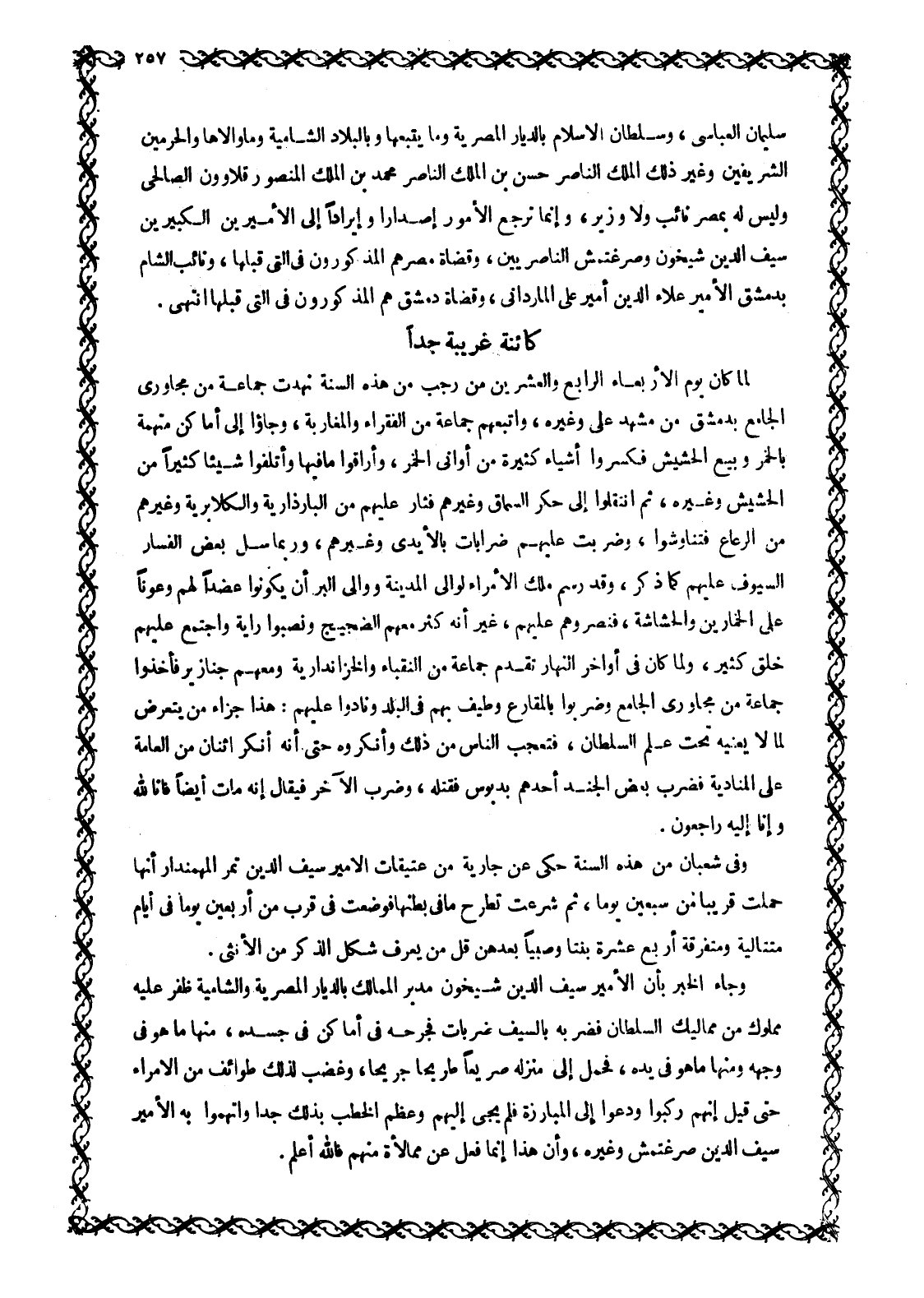 لَمَّا كَانَ يَوْمُ الْأَرْبِعَاءِ الرَّابِعِ وَالْعِشْرِينَ مِنْ رَجَبٍ مِنْ هَذِهِ السَّنَةِ نَهَدَتْ جَمَاعَةٌ مِنْ مُجَاوِرِي الْجَامِعِ بِدِمَشْقَ مِنْ مَشْهَدِ عَلِيٍّ وَغَيْرِهِ، وَاتَّبَعَهُمْ جَمَاعَةٌ مِنَ الْفُقَرَاءِ وَالْمَغَارِبَةِ، وَجَاءُوا إِلَى أَمَاكِنَ مُتَّهَمَةٍ بِالْخَمْرِ وَبَيْعِ الْحَشِيشِ فَكَسَرُوا أَشْيَاءَ كَثِيرَةً مِنْ أَوَانِي الْخَمْرِ، وَأَرَاقُوا مَا فِيهَا وَأَتْلَفُوا شَيْئًا كَثِيرًا مِنَ الْحَشِيشِ وَغَيْرِهِ، ثُمَّ انْتَقَلُوا إِلَى حِكْرِ السُّمَاقِ وَغَيْرِهِمْ فَثَارَ عَلَيْهِمْ مِنَ الْبَارْذَارِيَّةِ وَالْكَلَابَرِيَّةِ وَغَيْرِهِمْ من الرعاع فتناوشوا، وضربت عليهم ضرابات بالأيدي وغيرهم، وَرُبَّمَا سَلَّ بَعْضُ الْفُسَّاقِ السُّيُوفَ عَلَيْهِمْ كَمَا ذُكِرَ، وَقَدْ رَسَمَ مَلِكُ الْأُمَرَاءِ لِوَالِي الْمَدِينَةِ وَوَالِي الْبَرِّ أَنْ يَكُونُوا عَضُدًا لَهُمْ وَعَوْنًا عَلَى الْخَمَّارِينَ وَالْحَشَّاشَةِ، فَنَصَرُوهُمْ عَلَيْهِمْ، غَيْرَ أَنَّهُ كَثُرَ مَعَهُمُ الضَّجِيجُ وَنَصَبُوا رَايَةً وَاجْتَمَعَ عَلَيْهِمْ خَلْقٌ كَثِيرٌ، وَلَمَّا كَانَ فِي أَوَاخِرِ النَّهَارِ تَقَدَّمَ جَمَاعَةٌ مِنَ النُّقَبَاءِ وَالْخَزَانْدَارِيَّةِ وَمَعَهُمْ جَنَازِيرُ فأخذوا جماعة من مجاوري الجامع وَضُرِبُوا بِالْمَقَارِعِ وَطِيفَ بِهِمْ فِي الْبَلَدِ وَنَادَوْا عَلَيْهِمْ: هَذَا جَزَاءُ مَنْ يَتَعَرَّضُ لِمَا لَا يَعْنِيهِ تَحْتَ عِلْمِ السُّلْطَانِ، فَتَعَجَّبَ النَّاسُ مِنْ ذَلِكَ وَأَنْكَرُوهُ حَتَّى إِنَّهُ أَنْكَرَ اثْنَانِ مِنَ العامة على المنادية فضرب بعض الجند أحدهم بِدَبُّوسٍ فَقَتَلَهُ، وَضَرَبَ الْآخَرَ فَيُقَالُ إِنَّهُ مَاتَ أيضا ف إِنَّا لِلَّهِ وَإِنَّا إِلَيْهِ راجِعُونَ. 2: 156 وَفِي شَعْبَانَ مِنْ هَذِهِ السَّنَةِ حُكِيَ عَنْ جَارِيَةٍ مِنْ عَتِيقَاتِ الْأَمِيرِ سَيْفِ الدِّينِ تَمُرٍ الْمَهْمَنْدَارِ أَنَّهَا حَمَلَتْ قَرِيبًا مِنْ سَبْعِينَ يَوْمًا، ثُمَّ شَرَعَتْ تَطْرَحُ ما في بطنها فوضعت في قرب من أربعين يوما في أيام متتالية ومتفرقة أربع عشرة بنتا وصبيا بعدهن قل من يعرف شكل الذَّكَرِ مِنَ الْأُنْثَى.