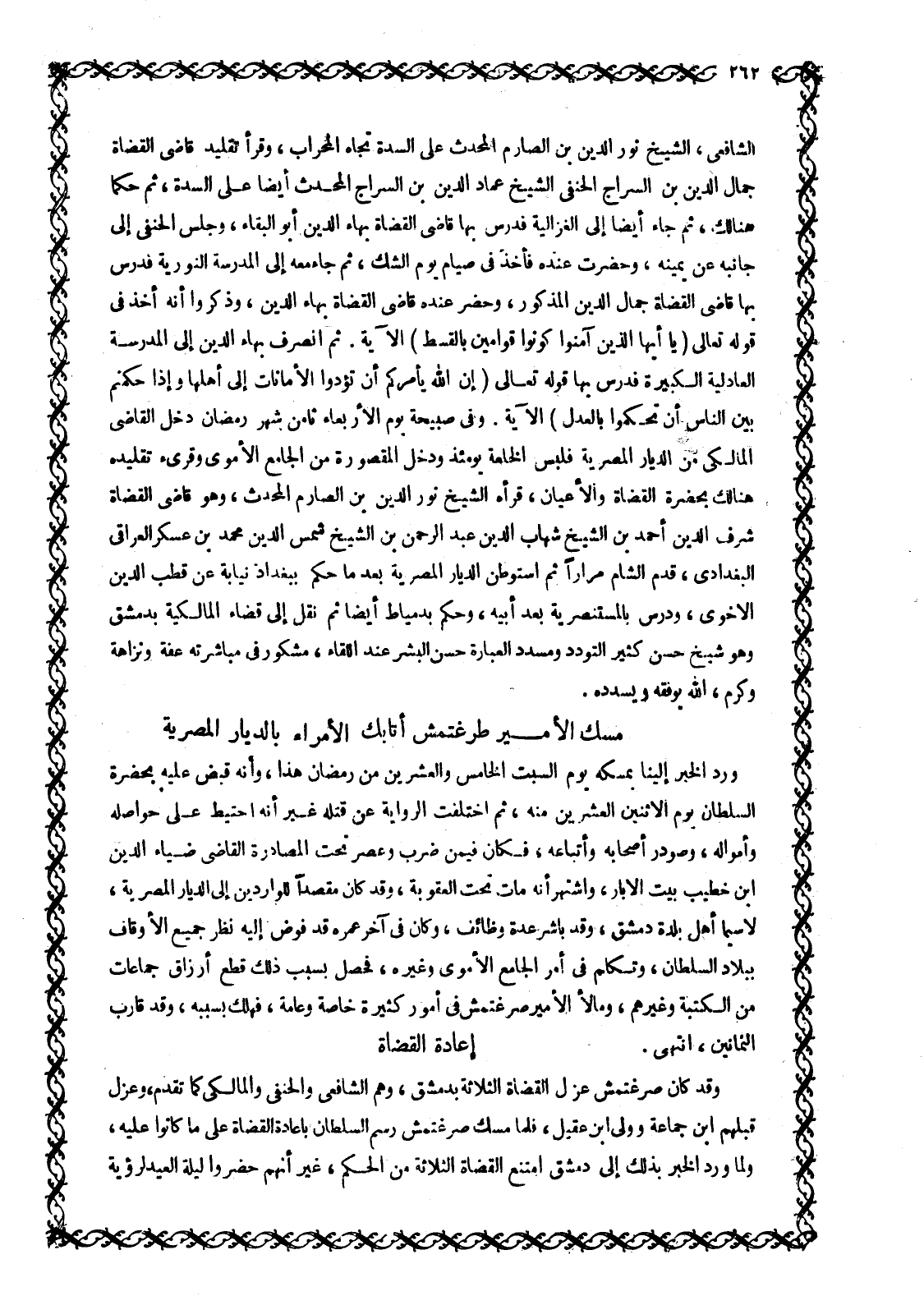 الشَّافِعِيِّ، الشَّيْخُ نُورُ الدِّينِ بْنُ الصَّارِمِ الْمُحَدِّثُ على السدة نجاه الْمِحْرَابِ، وَقَرَأَ تَقْلِيدَ قَاضِي الْقُضَاةِ جَمَالِ الدِّينِ بْنِ السَّرَّاجِ الْحَنَفِيِّ الشَّيْخُ عِمَادُ الدِّينِ بْنُ السَّرَّاجِ الْمُحَدِّثُ أَيْضًا عَلَى السُّدَّةِ، ثُمَّ حَكَمَا هنالك، ثم جاء أيضا إِلَى الْغَزَّالِيَّةِ فَدَرَّسَ بِهَا قَاضِي الْقُضَاةِ بَهَاءُ الدِّينِ أَبُو الْبَقَاءِ، وَجَلَسَ الْحَنَفِيُّ إِلَى جَانِبِهِ عَنْ يَمِينِهِ، وَحَضَرْتُ عِنْدَهُ فَأَخَذَ فِي صِيَامِ يوم الشك، ثم جاء معه إِلَى الْمَدْرَسَةِ النُّورِيَّةِ فَدَرَّسَ بِهَا قَاضِي الْقُضَاةِ جَمَالُ الدِّينِ الْمَذْكُورُ، وَحَضَرَ عِنْدَهُ قَاضِي الْقُضَاةِ بَهَاءُ الدِّينِ، وَذَكَرُوا أَنَّهُ أَخَذَ فِي قَوْلِهِ تَعَالَى يَا أَيُّهَا الَّذِينَ آمَنُوا كُونُوا قَوَّامِينَ بِالْقِسْطِ 4: 135 الآية. ثُمَّ انْصَرَفَ بَهَاءُ الدِّينِ إِلَى الْمَدْرَسَةِ الْعَادِلِيَّةِ الْكَبِيرَةِ فَدَرَّسَ بِهَا قَوْلُهُ تَعَالَى إِنَّ اللَّهَ يَأْمُرُكُمْ أَنْ تُؤَدُّوا الْأَماناتِ إِلى أَهْلِها وَإِذا حَكَمْتُمْ بَيْنَ النَّاسِ أَنْ تَحْكُمُوا بِالْعَدْلِ 4: 58 الآية. وَفِي صَبِيحَةِ يَوْمِ الْأَرْبِعَاءِ ثَامِنِ شَهْرِ رَمَضَانَ دَخَلَ الْقَاضِي الْمَالِكِيُّ مِنَ الدِّيَارِ الْمِصْرِيَّةِ فَلَبِسَ الْخِلْعَةَ يَوْمَئِذٍ وَدَخَلَ الْمَقْصُورَةَ مِنَ الْجَامِعِ الْأُمَوِيِّ وقرئ تقليده هنالك بِحَضْرَةِ الْقُضَاةِ وَالْأَعْيَانِ، قَرَأَهُ الشَّيْخُ نُورُ الدِّينِ بْنُ الصَّارِمِ الْمُحَدِّثُ، وَهُوَ قَاضِي الْقُضَاةِ شَرَفُ الدين أحمد بن الشيخ شهاب الدين عبد الرحمن بن الشَّيْخِ شَمْسِ الدِّينِ مُحَمَّدِ بْنِ عَسْكَرٍ الْعِرَاقِيُّ الْبَغْدَادِيُّ، قَدِمَ الشَّامَ مِرَارًا ثُمَّ اسْتَوْطَنَ الدِّيَارَ الْمِصْرِيَّةَ بَعْدَ مَا حَكَمَ بِبَغْدَادَ نِيَابَةً عَنْ قطب الدين الاخوى، وَدَرَّسَ بِالْمُسْتَنْصِرِيَّةِ بَعْدَ أَبِيهِ، وَحَكَمَ بِدِمْيَاطَ أَيْضًا ثُمَّ نُقِلَ إِلَى قَضَاءِ الْمَالِكِيَّةِ بِدِمَشْقَ وَهُوَ شَيْخٌ حَسَنٌ كَثِيرُ التَّوَدُّدِ وَمُسَدَّدُ الْعِبَارَةِ حَسَنُ الْبِشْرِ عِنْدَ اللِّقَاءِ، مَشْكُورٌ فِي مُبَاشَرَتِهِ عِفَّةٌ وَنَزَاهَةٌ وَكَرَمٌ، اللَّهُ يُوَفِّقُهُ وَيُسَدِّدُهُ.