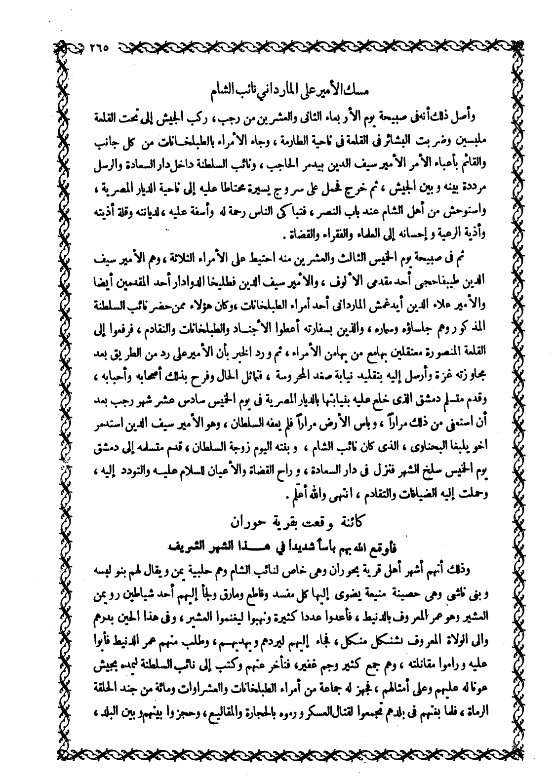 «فَأَوْقَعَ اللَّهُ بِهِمْ بَأْسًا شَدِيدًا فِي هَذَا الشَّهْرِ الشَّرِيفِ» وَذَلِكَ أَنَّهُمْ أَشْهَرُ أَهْلِ قَرْيَةٍ بِحَوْرَانَ وَهِيَ خَاصٌّ لِنَائِبِ الشَّامِ وَهُمْ حَلَبِيَّةُ يَمَنٍ وَيُقَالُ لَهُمْ بَنُو لَبْسَهْ وَبَنِي نَاشِي وَهِيَ حَصِينَةٌ مَنِيعَةٌ يَضْوِي إِلَيْهَا كُلُّ مُفْسِدٍ وَقَاطِعٍ وَمَارِقٍ وَلَجَأَ إليهم أحد شياطين رويمن الْعَشِيرِ وَهُوَ عُمَرُ الْمَعْرُوفُ بِالدُّنِيطِ، فَأَعَدُّوا عُدَدًا كَثِيرَةً وَنَهَبُوا لِيَغْنَمُوا الْعَشِيرَ، وَفِي هَذَا الْحِينِ بَدَرَهُمْ وَالِي الْوُلَاةِ الْمَعْرُوفُ بِشَنْكَلَ مَنْكَلَ، فَجَاءَ إِلَيْهِمْ لِيَرُدَّهُمْ وَيَهْدِيَهُمْ، وَطَلَبَ مِنْهُمْ عُمَرَ الدُّنِيطَ فَأَبَوْا عَلَيْهِ وَرَامُوا مُقَاتَلَتَهُ، وَهُمْ جَمْعٌ كَثِيرٌ وَجَمٌّ غَفِيرٌ، فَتَأَخَّرَ عَنْهُمْ وَكَتَبَ إِلَى نَائِبِ السَّلْطَنَةِ لِيَمُدَّهُ بِجَيْشٍ عَوْنًا لَهُ عَلَيْهِمْ وَعَلَى أمثالهم، فجهز له جماعة من أمراء الطبلخانات وَالْعَشَرَاوَاتِ وَمِائَةً مِنْ جُنْدِ الْحَلْقَةِ الرُّمَاةِ، فَلَمَّا بَغَتَهُمْ فِي بَلَدِهِمْ تَجَمَّعُوا لِقِتَالِ الْعَسْكَرِ وَرَمَوْهُ بِالْحِجَارَةِ وَالْمَقَالِيعِ، وَحَجَزُوا بَيْنَهُمْ وَبَيْنَ الْبَلَدِ،
