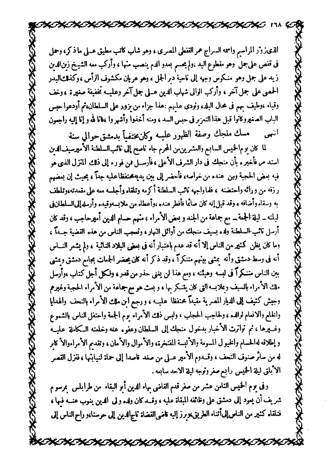 الَّذِي زَوَّرَ الْمَرَاسِيمَ وَاسْمُهُ السَّرَّاجُ عُمَرُ الْقِفْطِيُّ المصري، وهو شاب كاتب مطيق عَلَى مَا ذُكِرَ، وَحُمِلَ فِي قَفَصٍ عَلَى جَمَلٍ وَهُوَ مَقْطُوعُ الْيَدِ، وَلَمْ يُحْسَمْ بَعْدُ وَالدَّمُ يَنْصَبُّ مِنْهَا، وَأُرْكِبَ مَعَهُ الشَّيْخُ زَيْنُ الدِّينِ زِيدٌ عَلَى جَمَلٍ وَهُوَ مَنْكُوسٌ وَجْهُهُ إِلَى نَاحِيَةِ دُبُرِ الْجَمَلِ، وَهُوَ عُرْيَانُ مَكْشُوفُ الرَّأْسِ، وَكَذَلِكَ الْبَدْرُ الْحِمْصِيُّ عَلَى جَمَلٍ آخَرَ، وَأُرْكِبَ الْوَالِي شِهَابُ الدِّينِ عَلَى جَمَلٍ آخَرَ وَعَلَيْهِ تَخْفِيفَةٌ صَغِيرَةٌ، وَخُفٌّ وَقَبَاءٌ، وَطِيفَ بِهِمْ فِي مَحَالِّ الْبَلَدِ، وَنُودِيَ عَلَيْهِمْ: هَذَا جَزَاءُ مَنْ يُزَوِّرُ عَلَى السُّلْطَانِ، ثُمَّ أُوْدِعُوا حَبْسَ الْبَابِ الصَّغِيرِ وَكَانُوا قَبْلَ هَذَا التَّعْزِيرِ فِي حبس السد، ومنه أخذوا وأشهروا، ف إِنَّا لِلَّهِ وَإِنَّا إِلَيْهِ راجِعُونَ 2: 156 انتهى