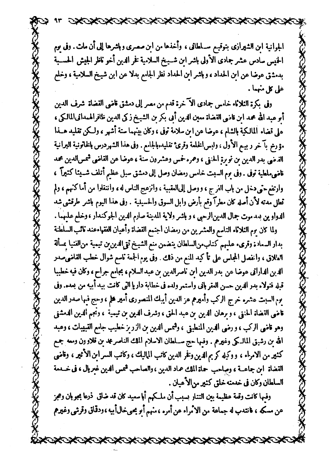 الْجَوَّانِيَّةِ ابْنُ الشِّيرَازِيِّ بِتَوْقِيعٍ سُلْطَانِيٍّ، وَأَخَذَهَا مِنِ ابْنِ صَصْرَى وَبَاشَرَهَا إِلَى أَنْ مَاتَ. وَفِي يَوْمِ الْخَمِيسِ سَادِسَ عَشَرَ جُمَادَى الْأُولَى بَاشَرَ ابْنُ شَيْخِ السَّلَامِيَّةِ فَخْرُ الدِّينِ أَخُو نَاظِرِ الْجَيْشِ الْحِسْبَةَ بِدِمَشْقَ عِوَضًا عَنِ ابْنِ الْحَدَّادِ، وباشر ابن الحداد نظر الجامع بدلا عَنِ ابْنِ شَيْخِ السَّلَامِيَّةِ، وَخُلِعَ عَلَى كُلٍّ مِنْهُمَا.