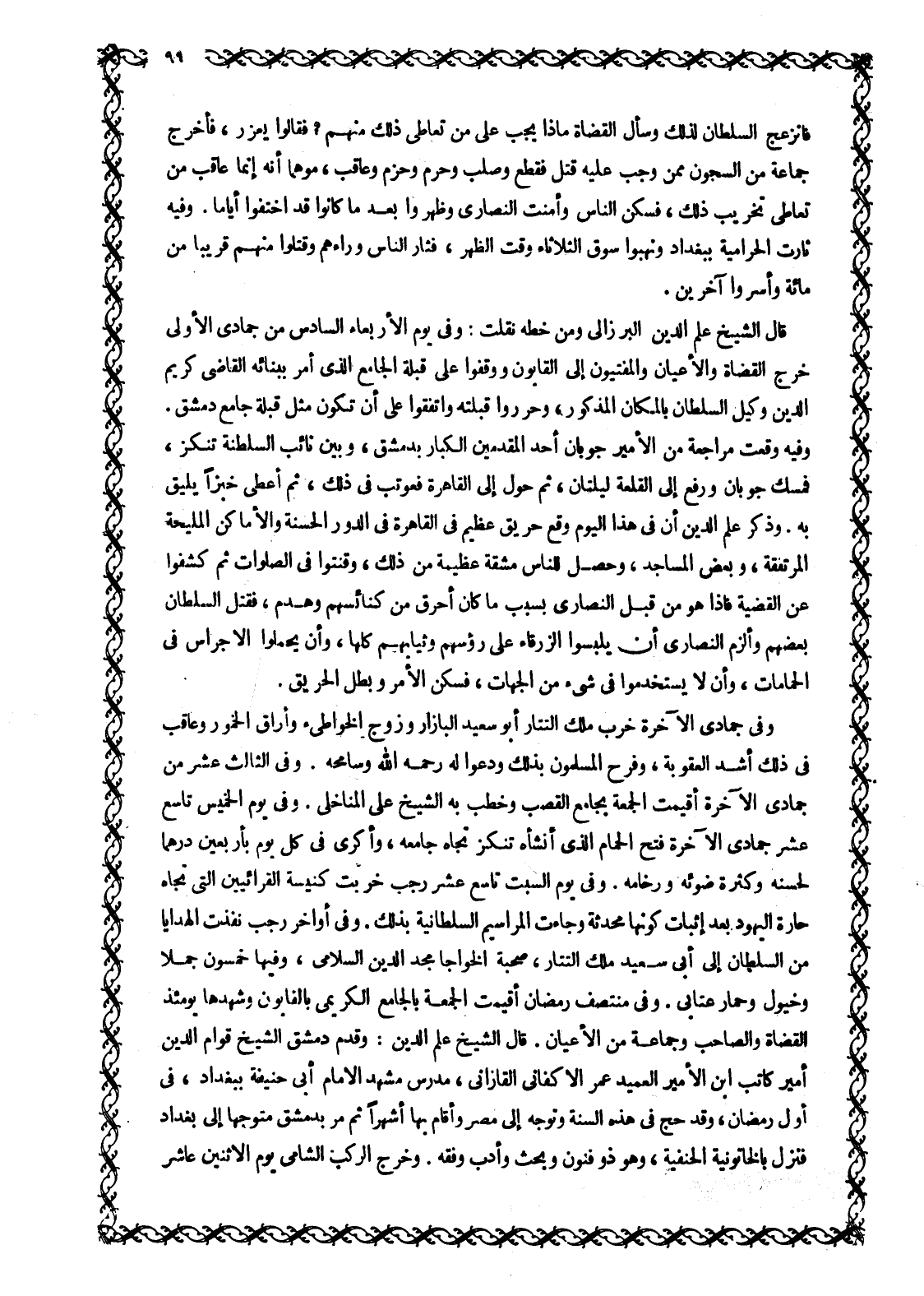 وَفِيهِ وَقَعَتْ مراجعة من الْأَمِيرِ جُوبَانَ أَحَدِ الْمُقَدَّمِينَ الْكِبَارِ بِدِمَشْقَ، وَبَيْنَ نَائِبِ السَّلْطَنَةِ تَنْكِزَ، فَمُسِكَ جُوبَانُ وَرُفِعَ إِلَى القلعة ليلتان، ثُمَّ حُوِّلَ إِلَى الْقَاهِرَةِ فَعُوتِبَ فِي ذَلِكَ، ثم أعطى خبزا يليق به. وذكر علم الدين أن في هذا اليوم وَقَعَ حَرِيقٌ عَظِيمٌ فِي الْقَاهِرَةِ فِي الدُّورِ الحسنة والأماكن المليحة المرتفقة، وَبَعْضِ الْمَسَاجِدِ، وَحَصَلَ لِلنَّاسِ مَشَقَّةٌ عَظِيمَةٌ مِنْ ذَلِكَ، وَقَنَتُوا فِي الصَّلَوَاتِ ثُمَّ كَشَفُوا عَنِ القضية فإذا هو من قبل النصارى بسبب ما كان أحرق مِنْ كَنَائِسِهِمْ وَهُدِمَ، فَقَتَلَ السُّلْطَانُ بَعْضَهُمْ وَأَلْزَمَ النصارى أن يلبسوا الزرقاء عَلَى رُءُوسِهِمْ وَثِيَابِهِمْ كُلِّهَا، وَأَنْ يَحْمِلُوا الْأَجْرَاسَ فِي الْحَمَّامَاتِ، وَأَنْ لَا يُسْتَخْدَمُوا فِي شَيْءٍ مِنَ الْجِهَاتِ، فَسَكَنَ الْأَمْرُ وَبَطَلَ الْحَرِيقُ.