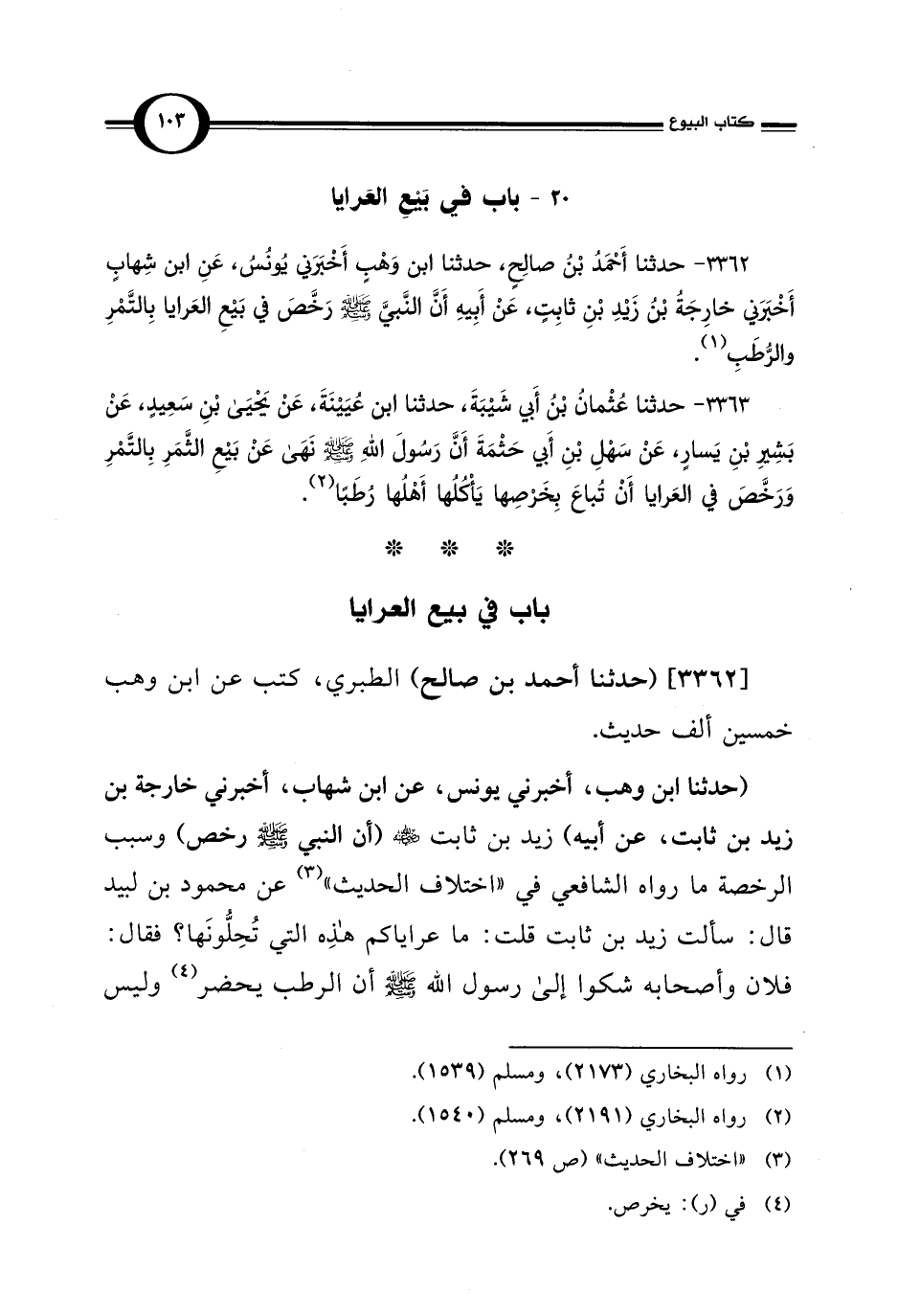3362 - حدثنا أَحْمَدُ بْنُ صالِحٍ، حدثنا ابن وَهْبٍ أَخْبَرَني يُونُسُ، عَنِ ابن شِهابٍ أَخْبَرَني خارِجَةُ بْن زَيْدِ بْنِ ثابِتٍ، عَنْ أَبِيهِ أَنَّ النَّبيَّ - صلى الله عليه وسلم - رَخَّصَ في بَيْعِ العَرايا بِالتَّمْرِ والرُّطَبِ (¬1).