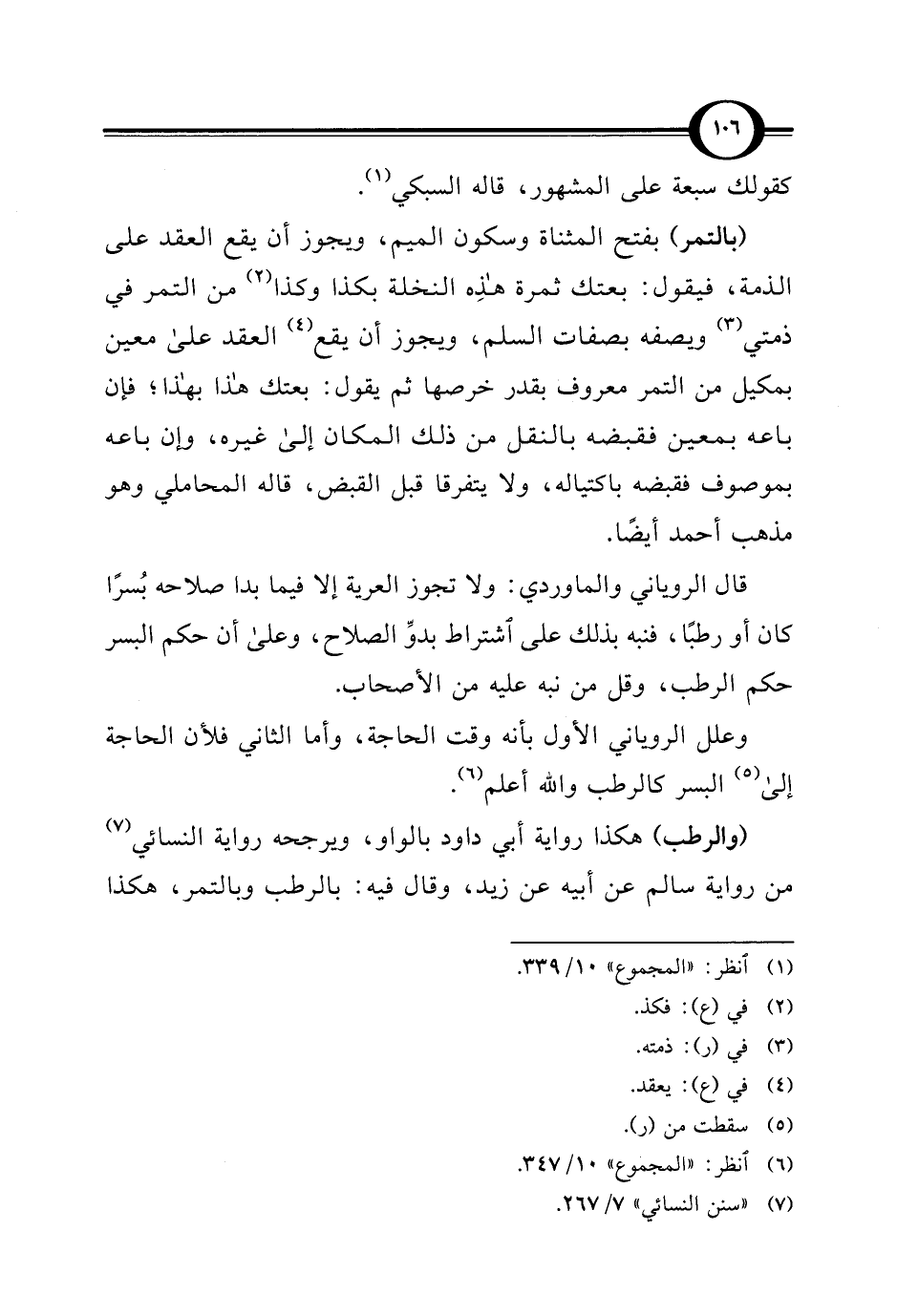 (والرطب) هكذا رواية أبي داود بالواو، ويرجحه رواية النسائي (¬7) من رواية سالم عن أبيه عن زيد، وقال فيه: بالرطب وبالتمر، هكذا