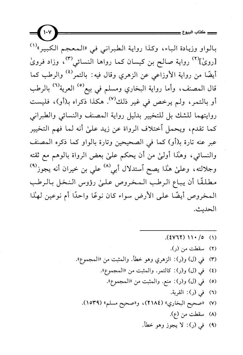 بالواو وزيادة الباء، وكذا رواية الطبراني في "المعجم الكبير" (¬1) [روى] (¬2) رواية صالح بن كيسان كما رواها النسائي (¬3)، وزاد فروى أيضًا من رواية الأوزاعي عن الزهري وقال فيه: بالتمر (¬4) والرطب كما قال المصنف، وأما رواية البخاري ومسلم في بيع (¬5) العرية (¬6) بالرطب أو بالتمر، ولم يرخص في غير ذلك (¬7). هكذا ذكراه بـ (أو)، فليست روايتهما للشك بل للتخيير بدليل رواية المصنف والنسائي والطبراني كما تقدم، ويحمل اختلاف الرواة عن زيد على أنه لما فهم التخيير عبر عنه تارة بـ (أو) كما في الصحيحين وتارة بالواو كما ذكره المصنف والنسائي، وهذا أولى من أن يحكم على بعض الرواة بالوهم مع ثقته وجلالته، وعلى هذا يصح استدلال أبي (¬8) علي بن خيران أنه يجوز (¬9) مطلقًا أن يباع الرطب المخروص على رؤوس النخل بالرطب المخروص أيضًا على الأرض سواء كان نوعًا واحدًا أم نوعين لهذا الحديث.