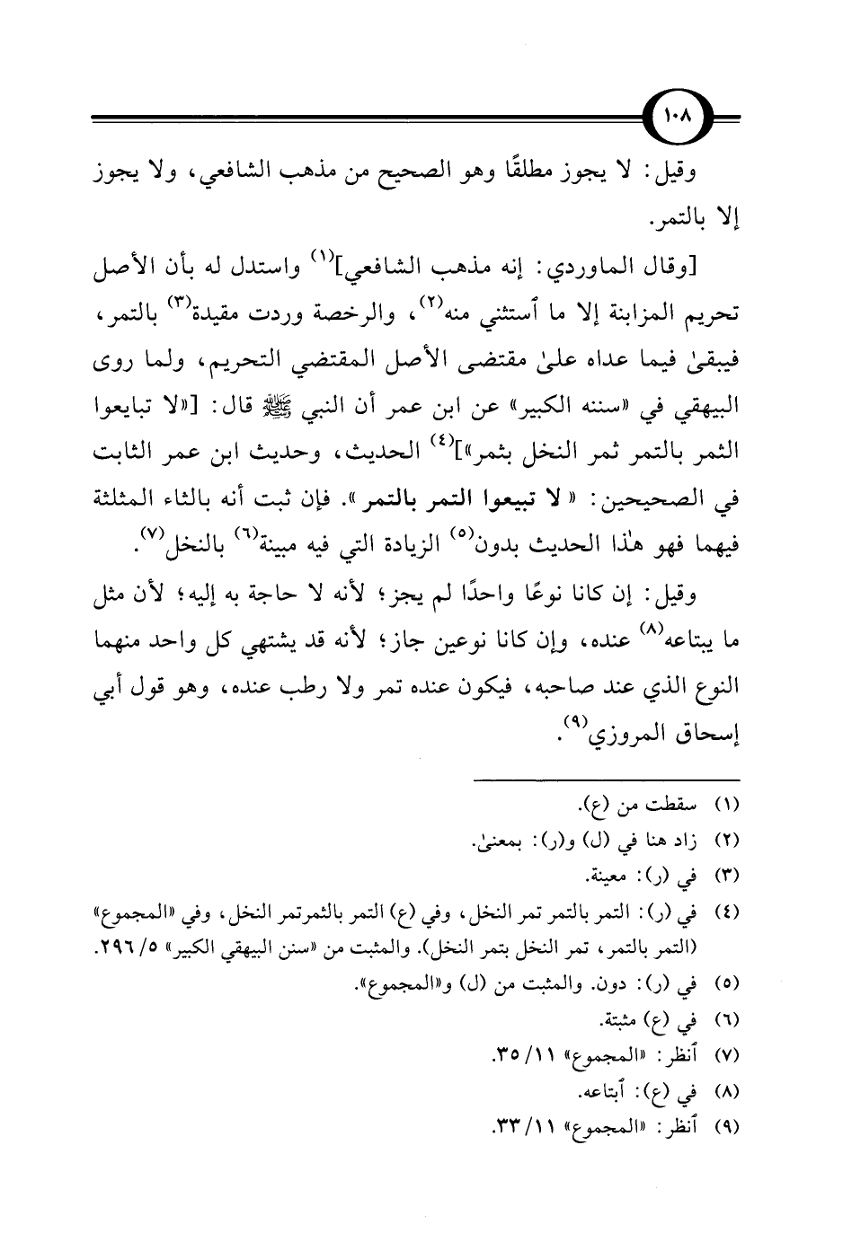 (¬4) في (ر): التمر بالتمر تمر النخل، وفي (ع) التمر بالثمر تمر النخل، وفي "المجموع" (التمر بالتمر، تمر النخل بتمر النخل). والمثبت من "سنن البيهقي الكبير" 5/ 296.