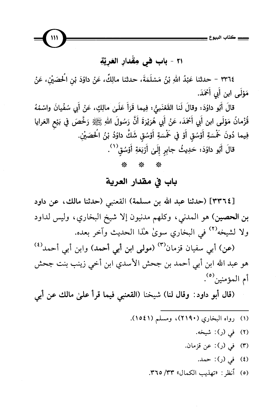 قالَ أَبُو داوُدَ: وقالَ لَنا القَعْنَبيُّ: فِيما قَرَأَ عَلَى مالِكٍ، عَنْ أَبي سُفْيانَ واسْمُهُ قُزْمانُ مَوْلَى ابن أَبي أَحْمَدَ، عَنْ أَبي هُرَيْرَةَ أَنَّ رَسُولَ اللهِ - صلى الله عليه وسلم - رَخَّصَ في بَيْعِ العَرايا فِيما دُونَ خَمْسَةِ أَوْسُقٍ أَوْ في خَمْسَةِ أَوْسُقٍ شَكَّ داوُدُ بْنُ الحُصَيْنِ.