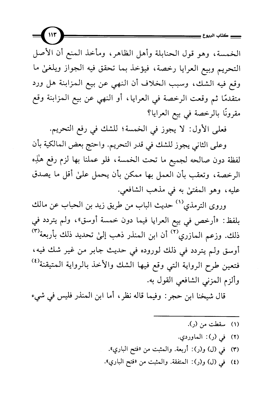 وروى الترمذي (¬1) حديث الباب من طريق زيد بن الحباب عن مالك بلفظ: "أرخص في بيع العرايا فيما دون خمسة أوسق"، ولم يتردد في ذلك. وزعم المازري (¬2) أن ابن المنذر ذهب إلى تحديد ذلك بأربعة (¬3) أوسق ولم يتردد في ذلك لوروده في حديث جابر من غير شك فيه، فتعين طرح الرواية التي وقع فيها الشك والأخذ بالرواية المتيقنة (¬4) وألزم المزني الشافعي القول به.