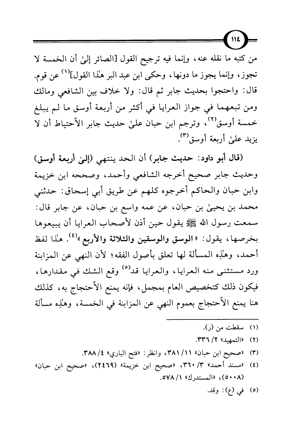 من كتبه ما نقله عنه، وإنما فيه ترجيح القول [الصائر إلى أن الخمسة لا تجوز، وإنما يجوز ما دونها، وحكى ابن عبد البر هذا القول] (¬1) عن قوم. قال: واحتجوا بحديث جابر ثم قال: ولا خلاف بين الشافعي ومالك ومن تبعهما في جواز العرايا في أكثر من أربعة أوسق ما لم يبلغ خمسة أوسق (¬2)، وترجم ابن حبان على حديث جابر الاحتياط أن لا يزيد على أربعة أوسق (¬3).