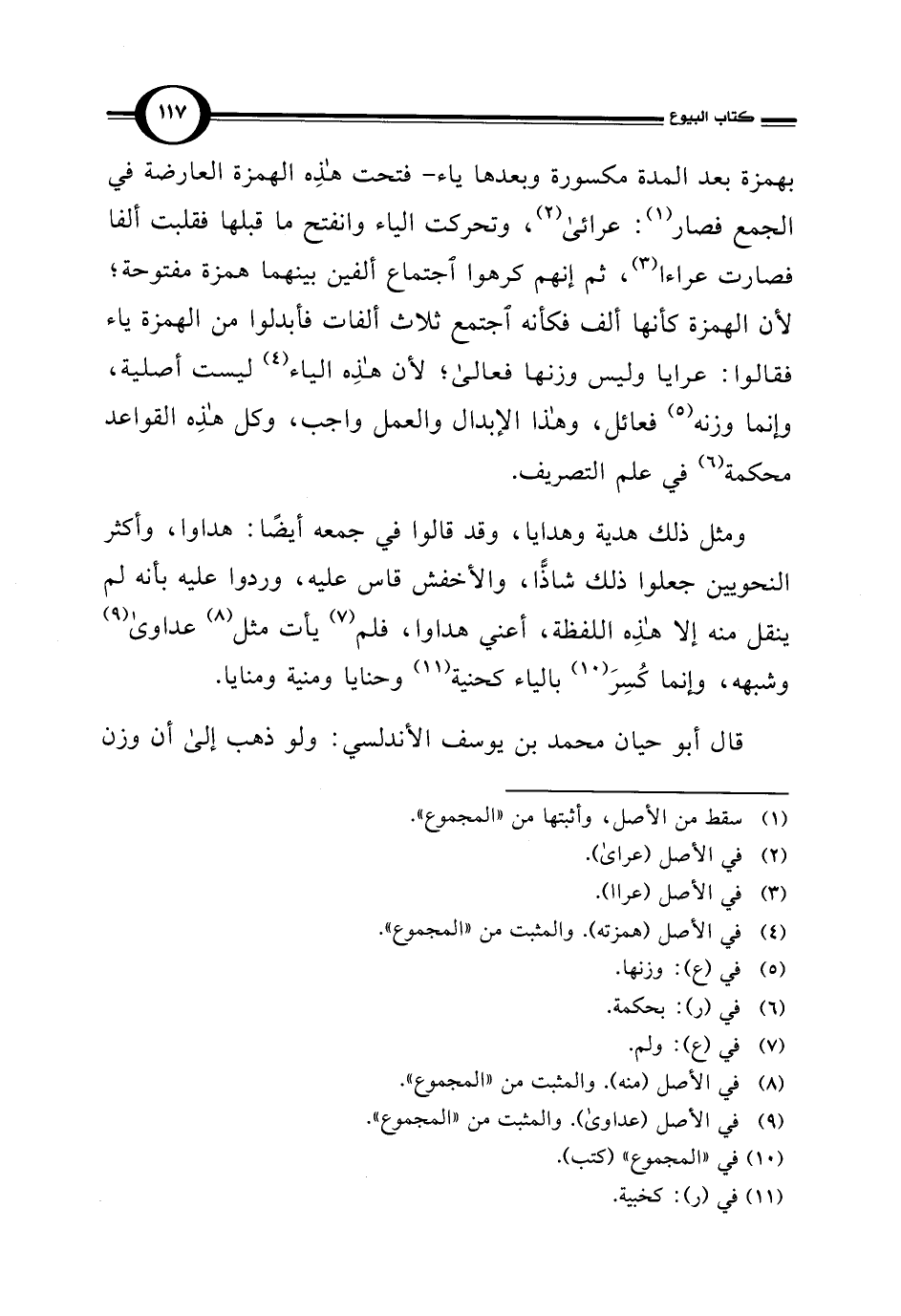 ومثل ذلك هدية وهدايا، وقد قالوا في جمعه أيضًا: هداوا، وأكثر النحويين جعلوا ذلك شاذًّا، والأخفش قاس عليه، وردوا عليه بأنه لم ينقل منه إلا هذِه اللفظة، أعني هداوا، فلم (¬7) يأت مثل (¬8) عداوى (¬9) وشبهه، وإنما كُسِرَ (¬10) بالياء كحنية (¬11) وحنايا ومنية ومنايا.