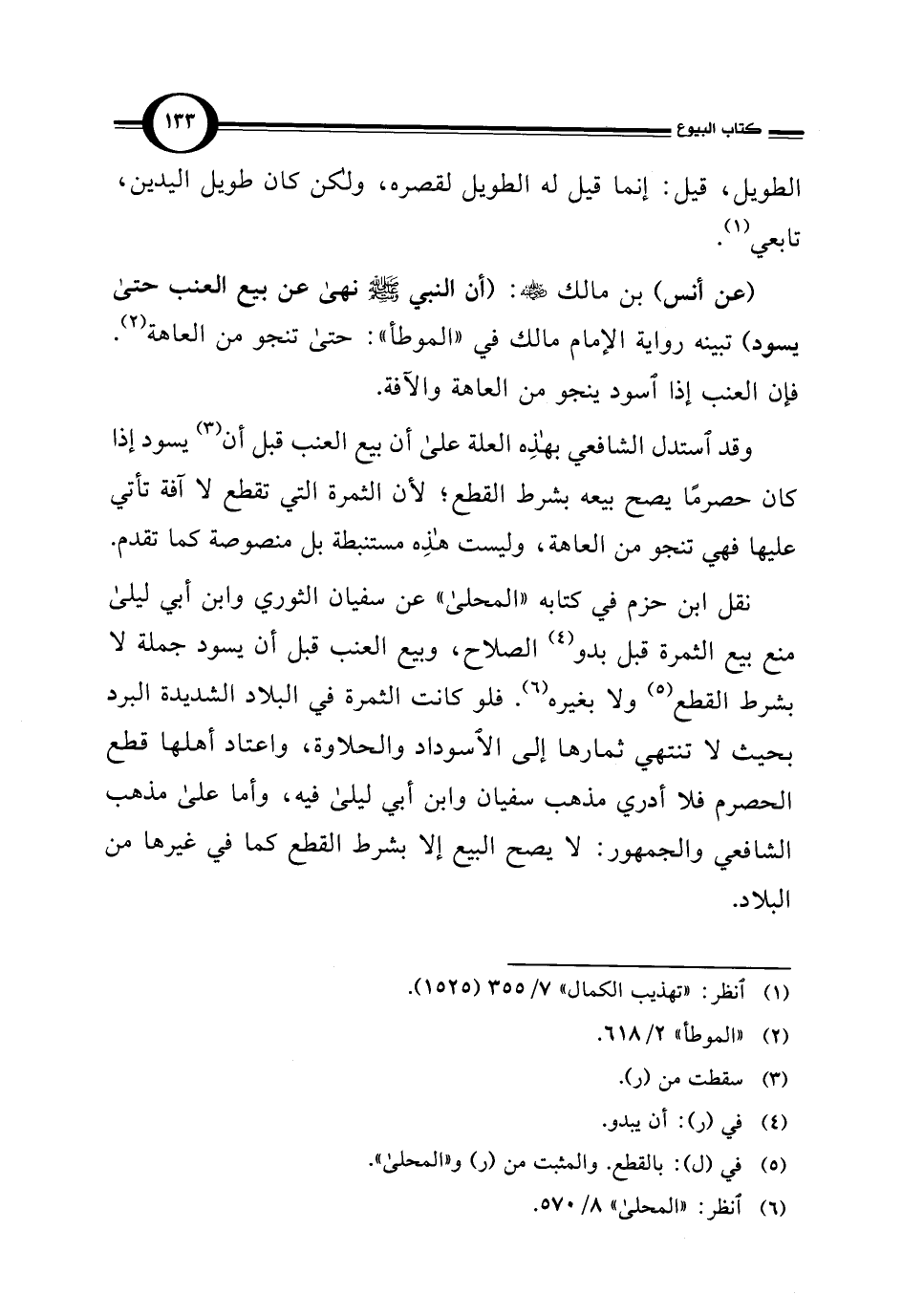 (عن أنس) بن مالك -رضي الله عنه-: (أن النبي - صلى الله عليه وسلم - نهى عن بيع العنب حتى يسود) تبينه رواية الإمام مالك في "الموطأ": حتى تنجو من العاهة (¬2). فإن العنب إذا اسود ينجو من العاهة والآفة.