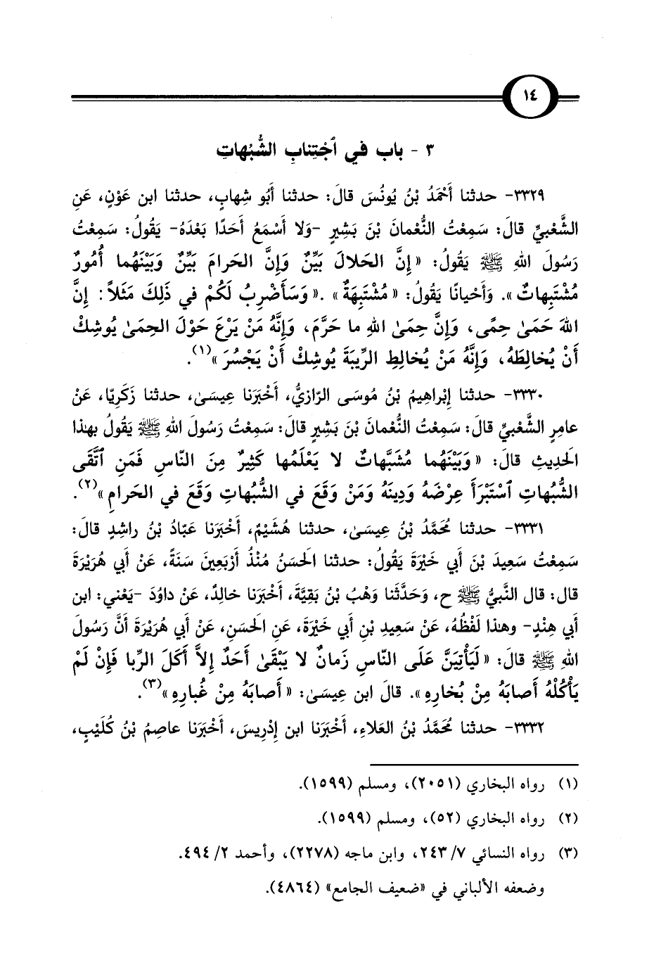 3330 - حدثنا إِبْراهِيمُ بْن مُوسَى الرّازيُّ، أَخْبَرَنا عِيسَى، حدثنا زَكَرِيَّا، عَنْ عامِبر الشَّعْبيِّ قالَ: سَمِعْتُ النُّعْمانَ بْنَ بَشِيرٍ قالَ: سَمِعْتُ رَسُولَ اللهِ - صلى الله عليه وسلم - يَقُول بهذا الحَدِيثِ قالَ: "وَبَيْنَهُما مُشَبَّهاتٌ لا يَعْلَمُها كَثِيرٌ مِنَ النّاسِ فَمَنِ اتَّقَى الشُّبُهاتِ اسْتَبْرَأَ عِرْضَهُ وَدِينَهُ وَمَنْ وَقَعَ في الشُّبُهاتِ وَقَعَ في الحَرامِ " (¬2).