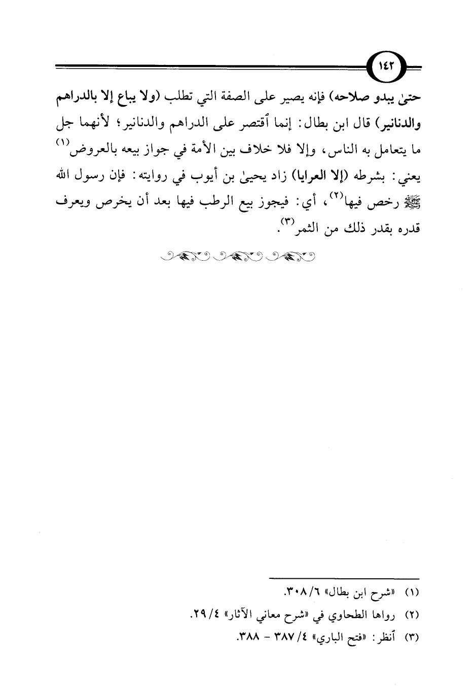 حتى يبدو صلاحه) فإنه يصير على الصفة التي تطلب (ولا يباع إلا بالدراهم والدنانير) قال ابن بطال: إنما اقتصر على الدراهم والدنانير؛ لأنهما جل ما يتعامل به الناس، وإلا فلا خلاف بين الأمة في جواز بيعه بالعروض (¬1) يعني: بشرطه (إلا العرايا) زاد يحيى بن أيوب في روايته: فإن رسول الله - صلى الله عليه وسلم - رخص فيها (¬2)، أي: فيجوز بيع الرطب فيها بعد أن يخرص ويعرف قدره بقدر ذلك من الثمر (¬3).