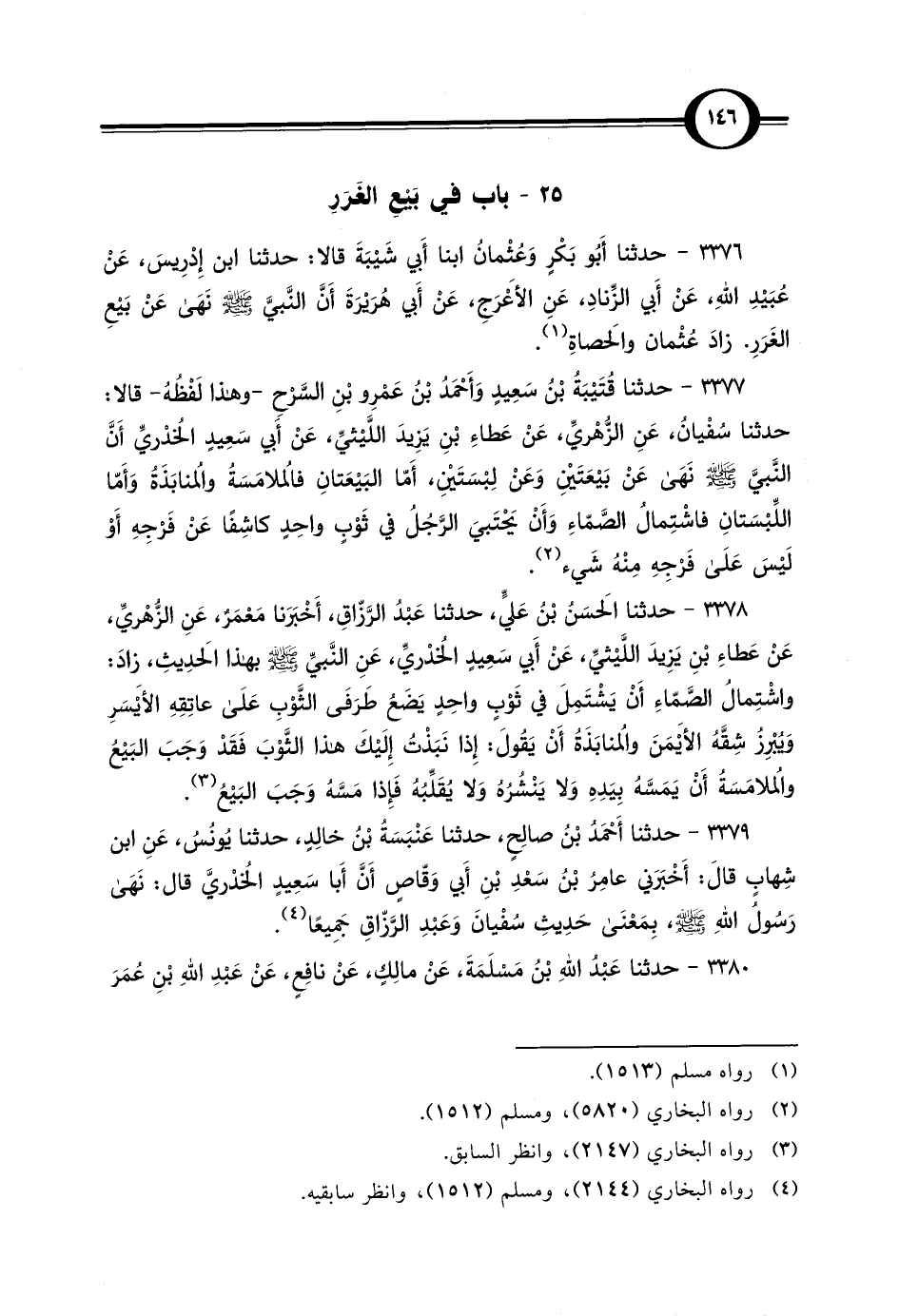 3377 - حدثنا قُتَيْبَةُ بْنُ سَعِيدٍ وَأَحْمَدُ بْن عَمْرِو بْنِ السَّرْحِ -وهذا لَفْظُهُ- قالا: حدثنا سُفْيانُ، عَنِ الزُّهْريِّ، عَنْ عَطاءِ بْنِ يَزِيدَ اللَّيْثيِّ، عَنْ أَبي سَعِيدٍ الخُدْريِّ أَنَّ النَّبيَّ - صلى الله عليه وسلم - نهَى عَنْ بَيْعَتَيْنِ وَعَنْ لِبْسَتَيْنِ، أَمّا البَيْعَتانِ فالمُلامَسَةُ والمُنابَذَةُ وَأَمّا اللِّبْسَتانِ فاشْتِمالُ الصَّمّاءِ وَأَنْ يَحْتَبيَ الرَّجُلُ في ثَوْبٍ واحِدٍ كاشِفًا عَنْ فَرْجِهِ أَوْ لَيْسَ عَلَى فَرْجِهِ مِنْهُ شَيء (¬2).