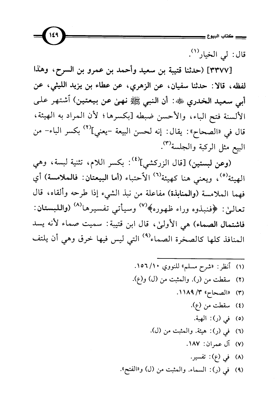 [3377] (حدثنا قتيبة بن سعيد وأحمد بن عمرو بن السرح، وهذا لفظه، قالا: حدثنا سفيان، عن الزهري، عن عطاء بن يزيد الليثي، عن أبي سعيد الخدري -رضي الله عنه-: أن النبي - صلى الله عليه وسلم - نهى عن بيعتين) اشتهر على الألسنة فتح الباء، والأحسن ضبطه [بكسرها؛ لأن المراد به الهيئة، قال في "الصحاح": يقال: إنه لحسن البيعة -يعني] (¬2) بكسر الباء- من البيع مثل الركبة والجلسة (¬3).