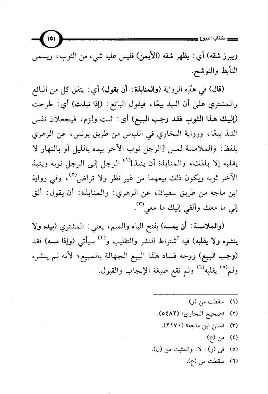 (قال) في هذِه الرواية (والمنابذة: أن يقول) أي: يتفق كل من البائع والمشتري على أن النبذ بيعًا، فيقول البائع: (إذا نبذت) أي: طرحت (إليك هذا الثوب فقد وجب البيع) أي: ثبت ولزم، فيجعلان نفس النبذ بيعًا، ورواية البخاري في اللباس من طريق يونس، عن الزهري بلفظ: والملامسة لمس [الرجل ثوب الآخر بيده بالليل أو بالنهار لا يقلبه إلا بذلك، والمنابذة أن ينبذ] (¬1) الرجل إلى الرجل ثوبه وينبذ الآخر ثوبه ويكون ذلك بيعهما من غير نظر ولا تراض (¬2)، وفي رواية ابن ماجه من طريق سفيان، عن الزهري: والمنابذة: أن يقول: ألق إلى ما معك وألقي إليك ما معي (¬3).
