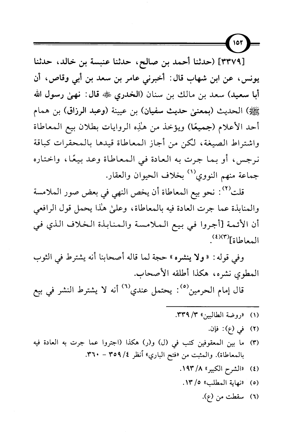 [3379] (حدثنا أحمد بن صالح، حدثنا عنبسة بن خالد، حدثنا يونس، عن ابن شهاب قال: أخبرني عامر بن سعد بن أبي وقاص، أن أبا سعيد) سعد بن مالك بن سنان (الخدري -رضي الله عنه- قال: نهى رسول الله - صلى الله عليه وسلم -) الحديث (بمعنى حديث سفيان) بن عيينة (وعبد الرزاق) بن همام أحد الأعلام (جميعًا) ويؤخذ من هذِه الروايات بطلان بيع المعاطاة واشتراط الصيغة، لكن من أجاز المعاطاة قيدها بالمحقرات كباقة نرجس، أو بما جرت به العادة في المعاطاة وعد بيعًا، واختاره جماعة منهم النووي (¬1) بخلاف الحيوان والعقار.
