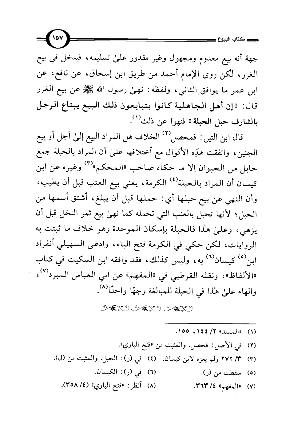قال ابن التين: فمحصل (¬2) الخلاف هل المراد البيع إلى أجل أو بيع الجنين، واتفقت هذِه الأقوال مع اختلافها على أن المراد بالحبلة جمع حابل من الحيوان إلا ما حكاه صاحب "المحكم" (¬3) وغيره عن ابن كيسان أن المراد بالحبلة (¬4) الكرمة، يعني بيع العنب قبل أن يطيب، وأن النهي عن بيع حبلها أي: حملها قبل أن يبلغ، اشتق اسمها من الحبل؛ لأنها تحبل بالعنب التي تحمله كما نهى بيع ثمر النخل قبل أن يزهي، وعلى هذا فالحبلة بإسكان الموحدة وهو خلاف ما ثبتت به الروايات، لكن حكي في الكرمة فتح الباء، وادعى السهيلي انفراد ابن (¬5) كيسان (¬6) به، وليس كذلك، فقد وافقه ابن السكيت في كتاب "الألفاظ"، ونقله القرطبي في "المفهم" عن أبي العباس المبرد (¬7)، والهاء على هذا في الحبلة للمبالغة وجهًا واحدًا (¬8).