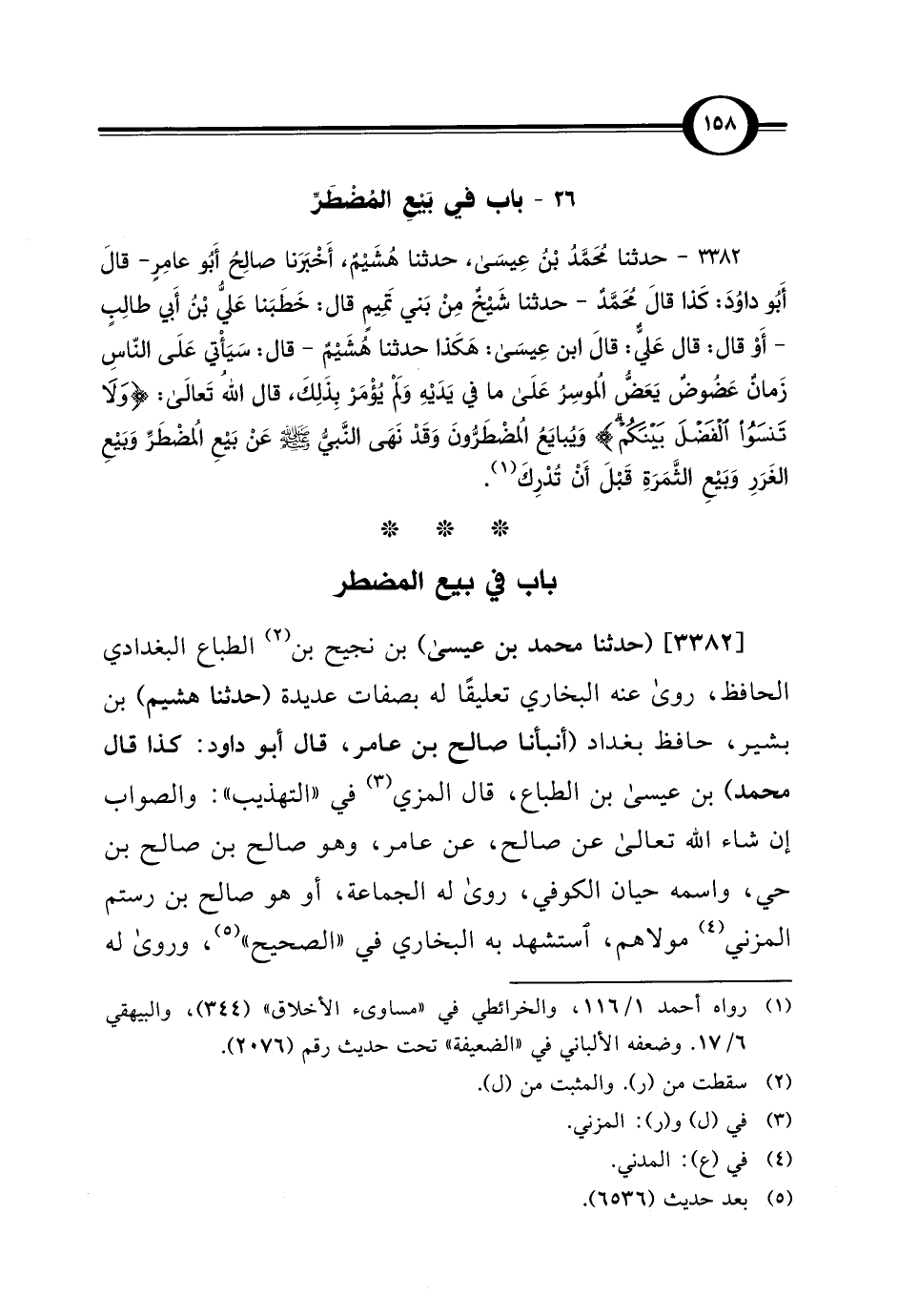 3382 - حدثنا مُحَمَّد بْنُ عِيسَى، حدثنا هُشَيْمٌ، أَخْبَرَنا صالِحُ أَبُو عامِرٍ - قالَ أَبُو داوُدَ: كَذا قالَ مُحَمَّدٌ - حدثنا شَيْخٌ مِنْ بَني تَمِيمٍ قال: خَطَبَنا عَليُّ بْنُ أَبي طالِبٍ - أَوْ قال: قال عَليٌّ: قالَ ابن عِيسَى: هَكَذا حدثنا هُشَيْمٌ - قال: سَيَأْتي عَلَى النّاسِ زَمانٌ عَضُوضُ يَعَضُّ المُوسِرُ عَلَى ما في يَدَيْهِ وَلَمْ يُؤْمَرْ بِذلِكَ، قال الله تَعالَى: {وَلَا تَنْسَوُا الْفَضْلَ بَيْنَكُمْ} وَيُبايَعُ المُضْطَرُّونَ وَقَدْ نَهَى النَّبيُّ - صلى الله عليه وسلم - عَنْ بَيْعِ المُضْطَرِّ وَبَيْعِ الغَرَرِ وَبَيْعِ الثَّمَرَةِ قَبْلَ أَنْ تُدْرِكَ (¬1).