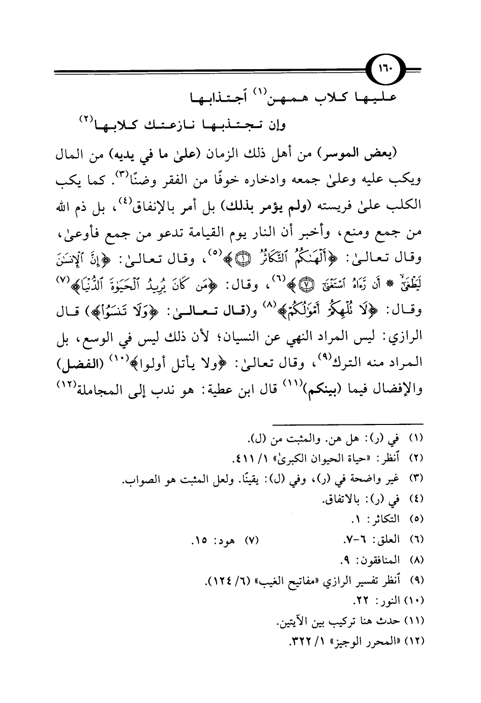 عليها كلاب همهن (¬1) اجتذابها ... وإن تجتذبها نازعتك كلابها (¬2) (يعض الموسر) من أهل ذلك الزمان (على ما في يديه) من المال ويكب عليه وعلى جمعه وادخاره خوفًا من الفقر وضنًا (¬3). كما يكب الكلب على فريسته (ولم يؤمر بذلك) بل أمر بالإنفاق (¬4)، بل ذم الله من جمع ومنع، وأخبر أن النار يوم القيامة تدعو من جمع فأوعى، وقال تعالى: {أَلْهَاكُمُ التَّكَاثُرُ (1)} (¬5)، وقال تعالى: {إِنَّ الْإِنْسَانَ لَيَطْغَى (6) أَنْ رَآهُ اسْتَغْنَى (7)} (¬6)، وقال: {مَنْ كَانَ يُرِيدُ الْحَيَاةَ الدُّنْيَا} (¬7) وقال: {لَا تُلْهِكُمْ أَمْوَالُكُمْ} (¬8) و (قال تعالى: {وَلَا تَنْسَوُا}) قال الرازي: ليس المراد النهي عن النسيان؛ لأن ذلك ليس في الوسع، بل المراد منه الترك (¬9)، وقال تعالى: {وَلَا يَأْتَلِ أُولُوا} (¬10) (الفضل) والإفضال فيما (بينكم) (¬11) قال ابن عطية: هو ندب إلى المجاملة (¬12)