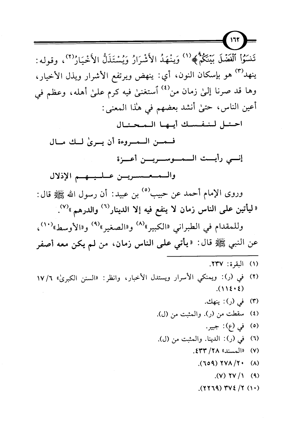 تَنْسَوُا الْفَضْلَ بَيْنَكُمْ} (¬1) وَينْهَدُ الأَشْرَارُ وَيُسْتَذَلُّ الأَخْيَارُ (¬2)، وقوله: ينهد (¬3) هو بإسكان النون، أي: ينهض ويرتفع الأشرار ويذل الأخيار، وها قد صرنا إلى زمان من (¬4) استغنى فيه كرم على أهله، وعظم في أعين الناس، حتى أنشد بعضهم في هذا المعنى: