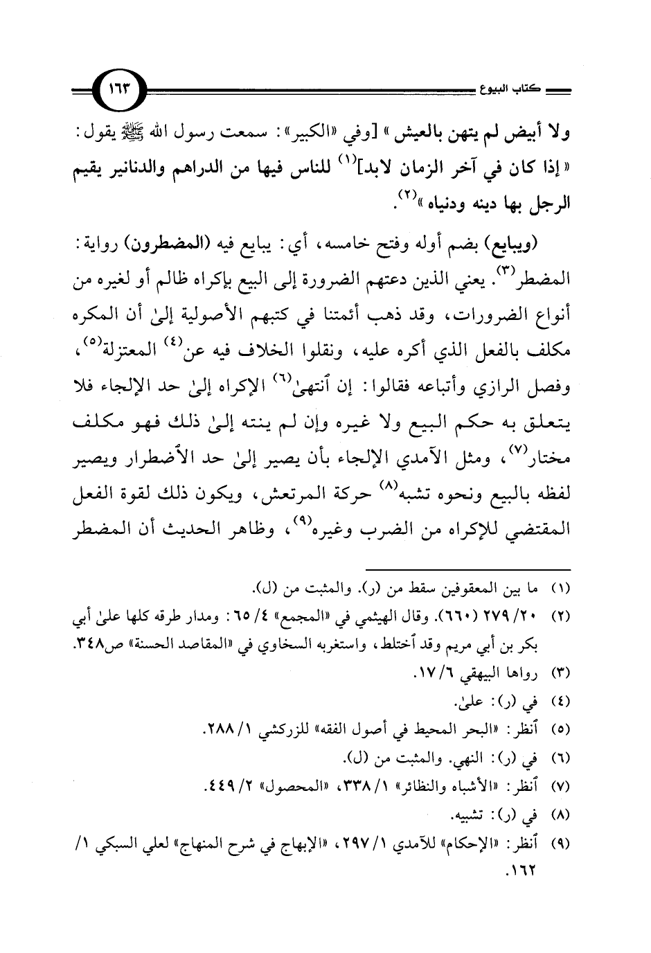 (ويبايع) بضم أوله وفتح خامسه، أي: يبايع فيه (المضطرون) رواية: المضطر (¬3). يعني الذين دعتهم الضرورة إلى البيع بإكراه ظالم أو لغيره من أنواع الضرورات، وقد ذهب أئمتنا في كتبهم الأصولية إلى أن المكره مكلف بالفعل الذي أكره عليه، ونقلوا الخلاف فيه عن (¬4) المعتزلة (¬5)، وفصل الرازي وأتباعه فقالوا: إن انتهى (¬6) الإكراه إلى حد الإلجاء فلا يتعلق به حكم البيع ولا غيره وإن لم ينته إلى ذلك فهو مكلف مختار (¬7)، ومثل الآمدي الإلجاء بأن يصير إلى حد الاضطرار ويصير لفظه بالبيع ونحوه تشبه (¬8) حركة المرتعش، ويكون ذلك لقوة الفعل المقتضي للإكراه من الضرب وغيره (¬9)، وظاهر الحديث أن المضطر