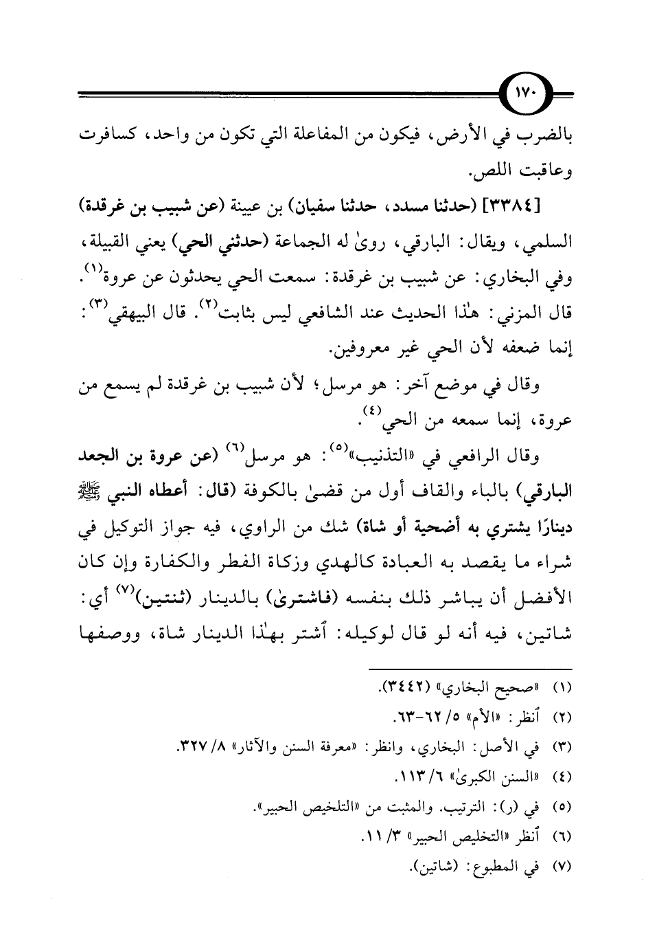 [3384] (حدثنا مسدد، حدثنا سفيان) بن عيينة (عن شبيب بن غرقدة) السلمي، ويقال: البارقي، روى له الجماعة (حدثني الحي) يعني القبيلة، وفي البخاري: عن شبيب بن غرقدة: سمعت الحي يحدثون عن عروة (¬1). قال المزني: هذا الحديث عند الشافعي ليس بثابت (¬2). قال البيهقي (¬3): إنما ضعفه لأن الحي غير معروفين.