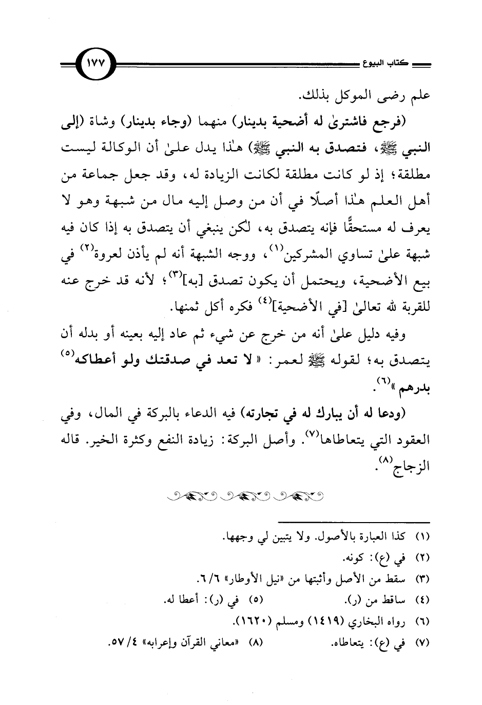 (فرجع فاشترى له أضحية بدينار) منهما (وجاء بدينار) وشاة (إلى النبي - صلى الله عليه وسلم -، فتصدق به النبي - صلى الله عليه وسلم -) هذا يدل على أن الوكالة ليست مطلقة؛ إذ لو كانت مطلقة لكانت الزيادة له، وقد جعل جماعة من أهل العلم هذا أصلًا في أن من وصل إليه مال من شبهة وهو لا يعرف له مستحقًّا فإنه يتصدق به، لكن ينبغي أن يتصدق به إذا كان فيه شبهة على تساوي المشركين (¬1)، ووجه الشبهة أنه لم يأذن لعروة (¬2) في بيع الأضحية، ويحتمل أن يكون تصدق [به] (¬3)؛ لأنه قد خرج عنه للقربة لله تعالى [في الأضحية] (¬4) فكره أكل ثمنها.