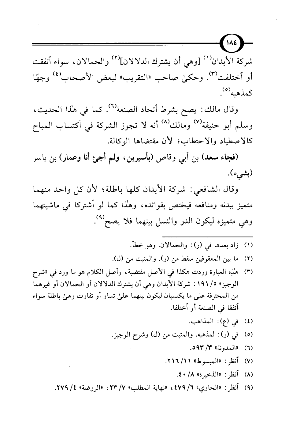 (¬3) هذِه العبارة وردت هكذا في الأصل مقتضبة، وأصل الكلام هو ما ورد في "شرح الوجيز" 5/ 191: شركة الأبدان وهي أن يشترك الدلالان أو الحمالان أو غيرهما من المحترفة على ما يكتسبان ليكون بينهما على تساو أو تفاوت وهى باطلة سواء اتفقا في الصنعة أو اختلفا.
