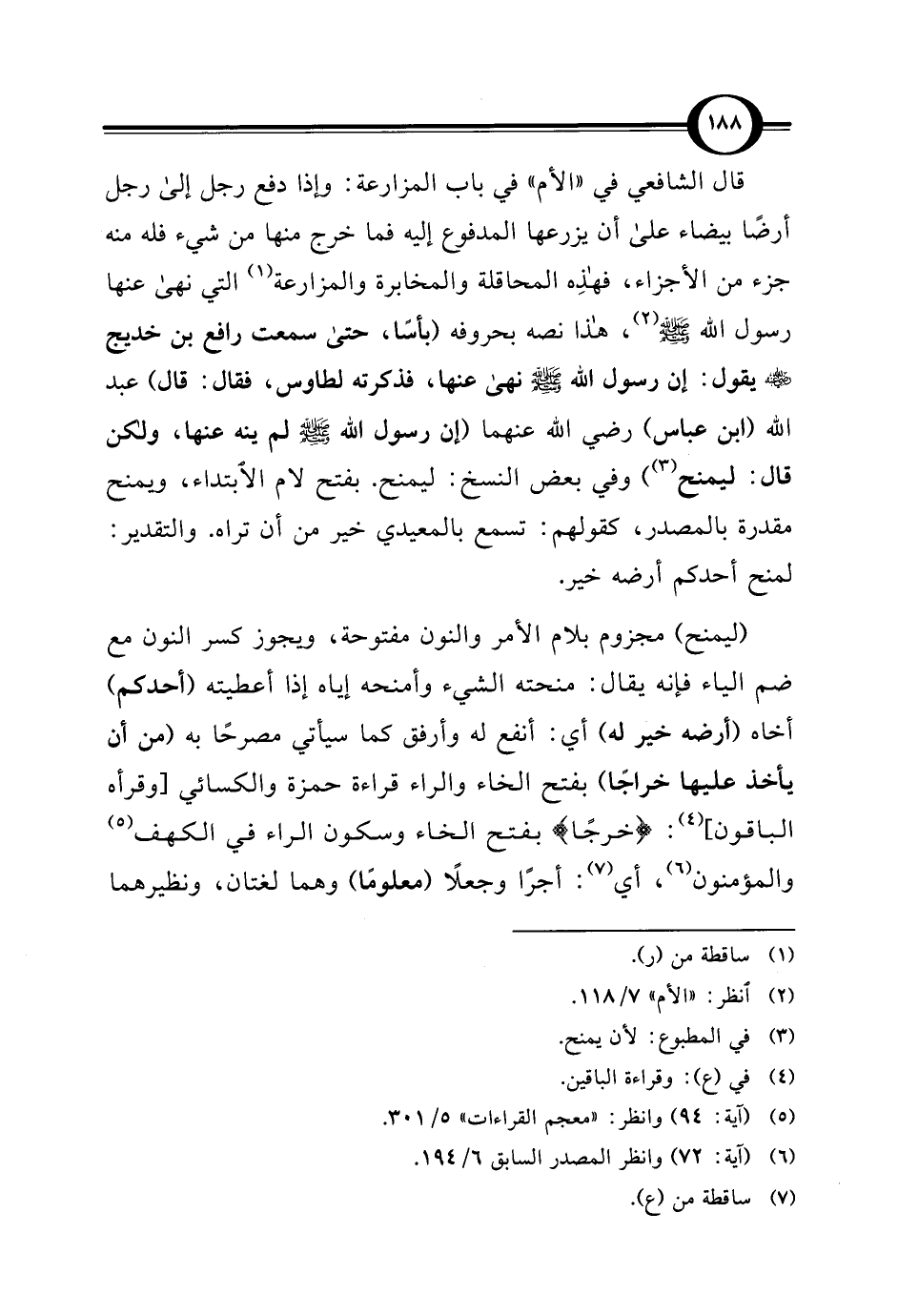 قال الشافعي في "الأم" في باب المزارعة: وإذا دفع رجل إلى رجل أرضًا بيضاء على أن يزرعها المدفوع إليه فما خرج منها من شيء فله منه جزء من الأجزاء، فهذِه المحاقلة والمخابرة والمزارعة (¬1) التي نهى عنها رسول الله - صلى الله عليه وسلم - (¬2)، هذا نصه بحروفه (بأسًا، حتى سمعت رافع بن خديج -رضي الله عنه- يقول: إن رسول الله - صلى الله عليه وسلم - نهى عنها، فذكرته لطاوس، فقال: قال) عبد الله (ابن عباس) -رضي الله عنهما- (إن رسول الله - صلى الله عليه وسلم - لم ينه عنها، ولكن قال: ليمنح) (¬3) وفي بعض النسخ: ليمنح. بفتح لام الابتداء، ويمنح مقدرة بالمصدر، كقولهم: تسمع بالمعيدي خير من أن تراه. والتقدير: لمنح أحدكم أرضه خير.