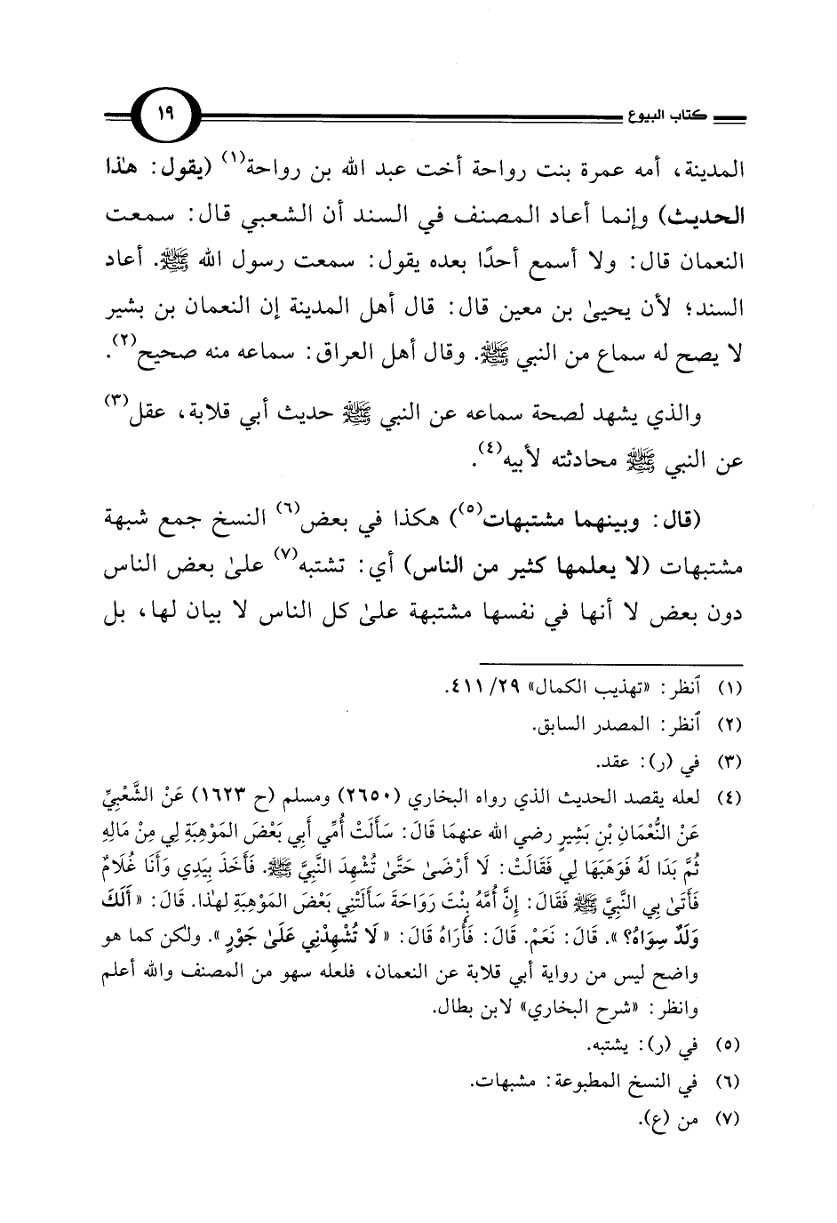 (¬4) لعله يقصد الحديث الذي رواه البخاري (2650) ومسلم (ح 1623) عَنْ الشَّعْبِيِّ عَنْ النُّعْمَانِ بْنِ بَشِيرٍ رضي الله عنهمَا قَالَ: سَأَلَتْ أُمِّي أَبِي بَعْضَ المَوْهِبَةِ لِي مِنْ مَالِهِ ثُمَّ بَدَا لَهُ فَوَهَبَهَا لِي فَقَالَتْ: لَا أَرْضَى حَتَّى تُشْهِدَ النَّبِيَّ - صلى الله عليه وسلم -. فَأَخَذَ بِيَدِي وَأَنَا غُلَامٌ فَأَتَى بِي النَّبِيَّ - صلى الله عليه وسلم - فَقَالَ: إِنَّ أُمَّهُ بِنْتَ رَوَاحَةَ سَأَلَتْنِي بَعْضَ المَوْهِبَةِ لهذا. قَالَ: " أَلَكَ وَلَدٌ سِوَاهُ؟ ". قَالَ: نَعَمْ. قَالَ: فَأُرَاهُ قَالَ: " لَا تُشْهِدْنِي عَلَى جَوْرٍ ". ولكن كما هو واضح ليس من رواية أبي قلابة عن النعمان، فلعله سهو من المصنف والله أعلم وانظر: "شرح البخاري" لابن بطال.