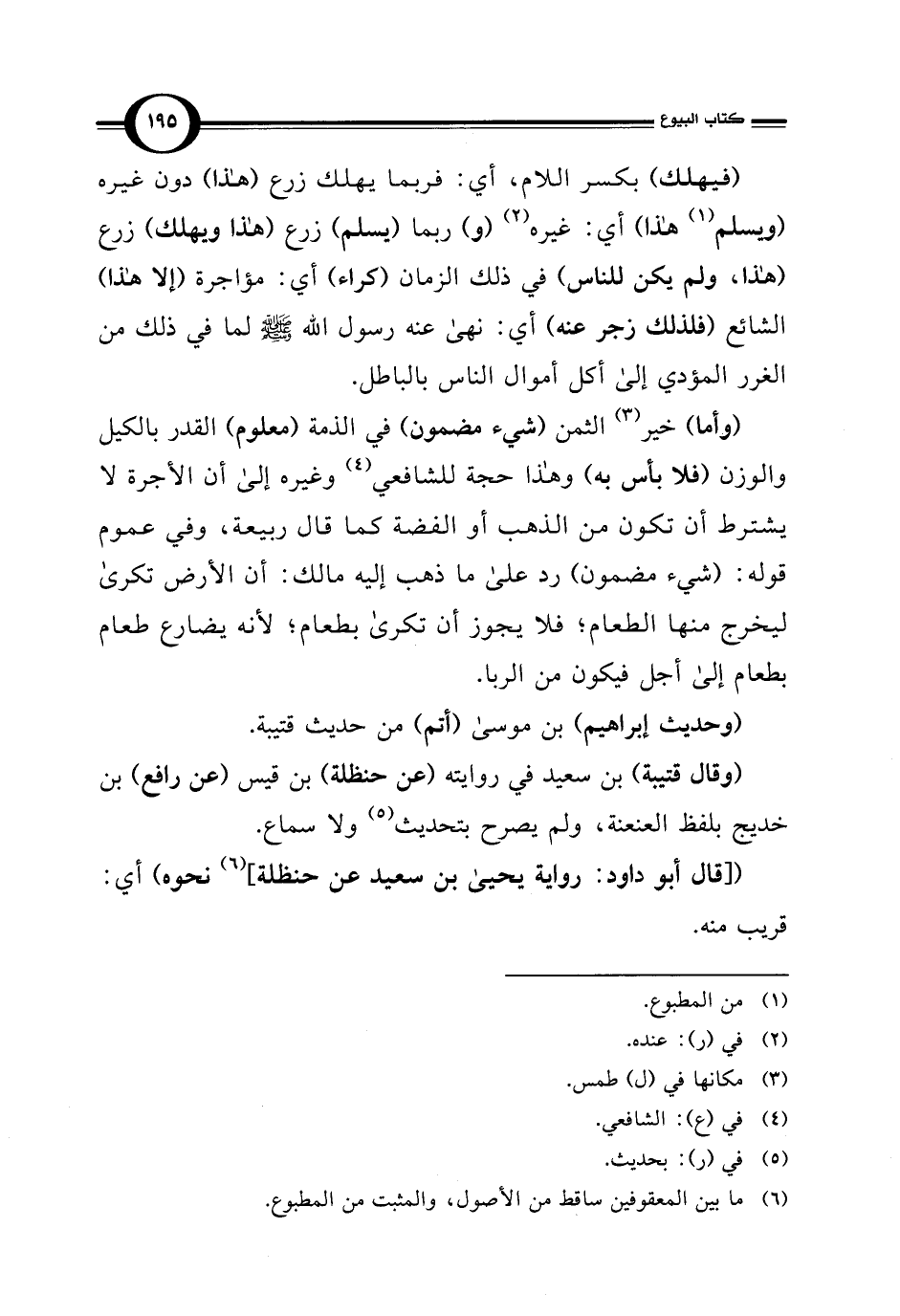 (وأما) خير (¬3) الثمن (شيء مضمون) في الذمة (معلوم) القدر بالكيل والوزن (فلا بأس به) وهذا حجة للشافعي (¬4) وغيره إلى أن الأجرة لا يشترط أن تكون من الذهب أو الفضة كما قال ربيعة، وفي عموم قوله: (شيء مضمون) رد على ما ذهب إليه مالك: أن الأرض تكرى ليخرج منها الطعام؛ فلا يجوز أن تكرى بطعام؛ لأنه يضارع طعام بطعام إلى أجل فيكون من الربا.