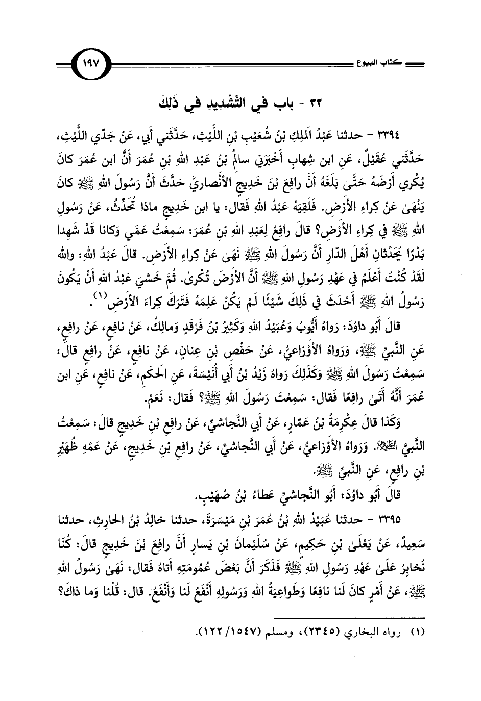 3394 - حدثنا عَبْدُ المَلِكِ بْنُ شُعَيْبِ بْنِ اللَّيْثِ، حَدَّثَني أَبي، عَنْ جَدّي اللَّيْثِ، حَدَّثَني عُقَيْلٌ، عَنِ ابن شِهابٍ أَخْبَرَني سالِمُ بْنُ عَبْدِ الله بْنِ عُمَرَ أَنَّ ابن عُمَرَ كانَ يُكْري أَرْضَهُ حَتَّى بَلَغَهُ أَنَّ رافِعَ بْنَ خَدِيجٍ الأنصاريَّ حَدَّثَ أَنَّ رَسُولَ الله - صلى الله عليه وسلم - كانَ يَنْهَى عَنْ كِراءِ الأَرْضِ. فَلَقِيَهُ عَبْدُ الله فَقال: يا ابن خَدِيجٍ ماذا تُحَدِّثُ، عَنْ رَسُولِ الله - صلى الله عليه وسلم - في كِراءِ الأَرْضِ؟ قالَ رافِعٌ لِعَبْدِ اللهِ بْنِ عُمَرَ: سَمِعْتُ عَمَّي وَكانا قَدْ شَهِدا بَدْرًا يُحَدِّثانِ أَهْلَ الدّارِ أَنَّ رَسُولَ الله - صلى الله عليه وسلم - نَهَى عَنْ كِراءِ الأَرْضِ. قالَ عَبْدُ الله: والله لَقَدْ كُنْتُ أَعْلَمُ في عَهْدِ رَسُولِ الله - صلى الله عليه وسلم - أَنَّ الأرْضَ تُكْرى. ثمَّ خَشيَ عِبْدُ الله أَنْ يَكونَ رَسُول اللهِ - صلى الله عليه وسلم - أحْدَثَ في ذَلِكَ شَيْئًا لَمْ يَكُنْ عَلِمَهُ فَتَرَكَ كِراءَ الأَرْضِ (¬1).