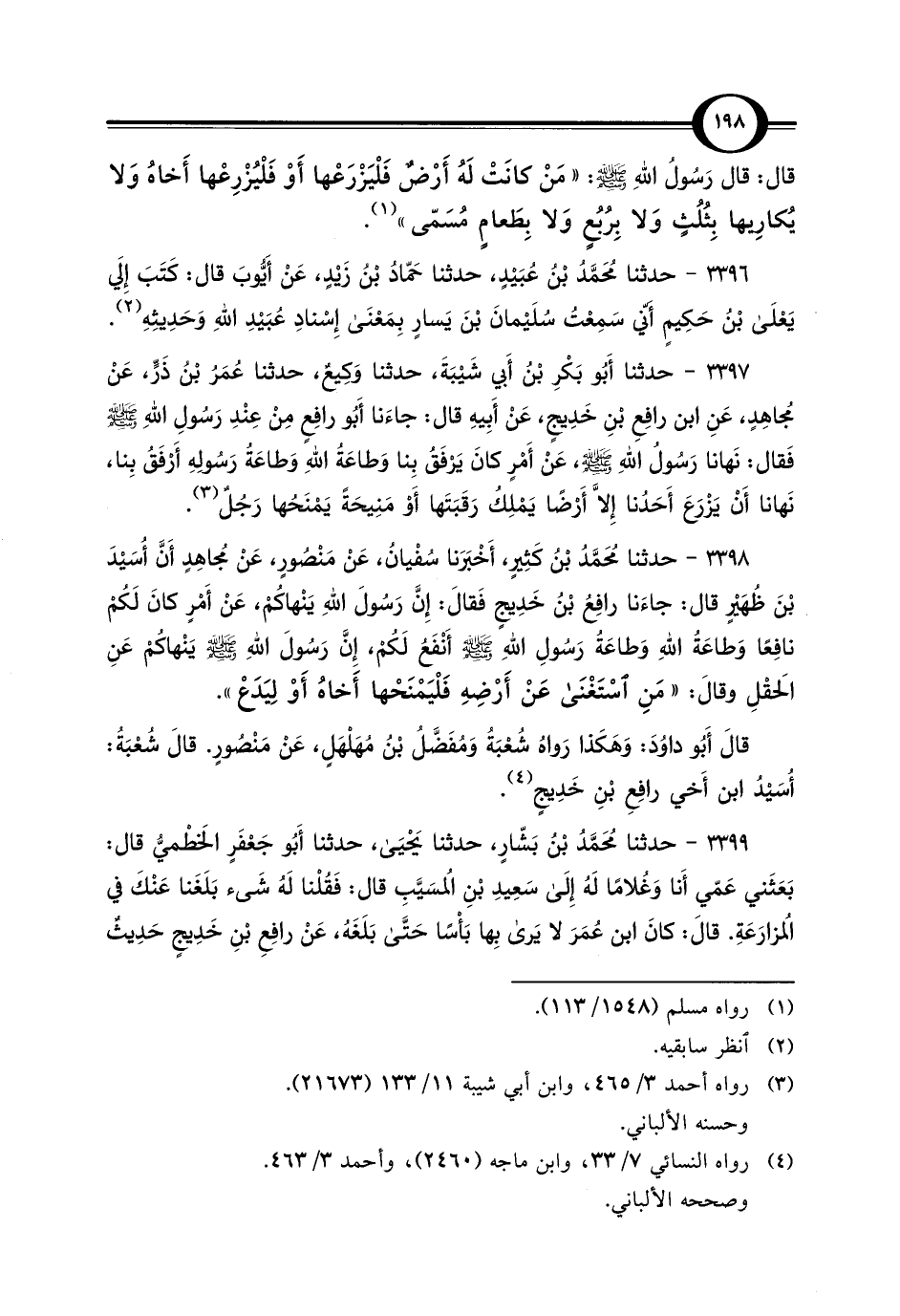 3398 - حدثنا مُحَمَّدُ بْن كَثِيرٍ، أَخْبَرَنا سُفْيانُ، عَنْ مَنْصُورٍ، عَنْ مُجاهِدٍ أَنَّ أسَيْدَ بْنَ ظُهَيْرٍ قال: جاءَنا رافِعُ بْن خَدِيجٍ فَقالَ: إِنَّ رَسُولَ الله يَنْهاكُمْ، عَنْ أَمْرٍ كانَ لَكُمْ نافِعًا وَطاعَةُ اللهِ وَطاعَةُ رَسُولِ الله - صلى الله عليه وسلم - أَنْفَعُ لَكُمْ، إِنَّ رَسُولَ الله - صلى الله عليه وسلم - يَنْهاكُمْ عَنِ الحَقْلِ وقالَ: "مَنِ اسْتَغْنَى عَنْ أَرْضِهِ فَلْيَمْنَحْها أَخاهُ أَوْ لِيَدَعْ".