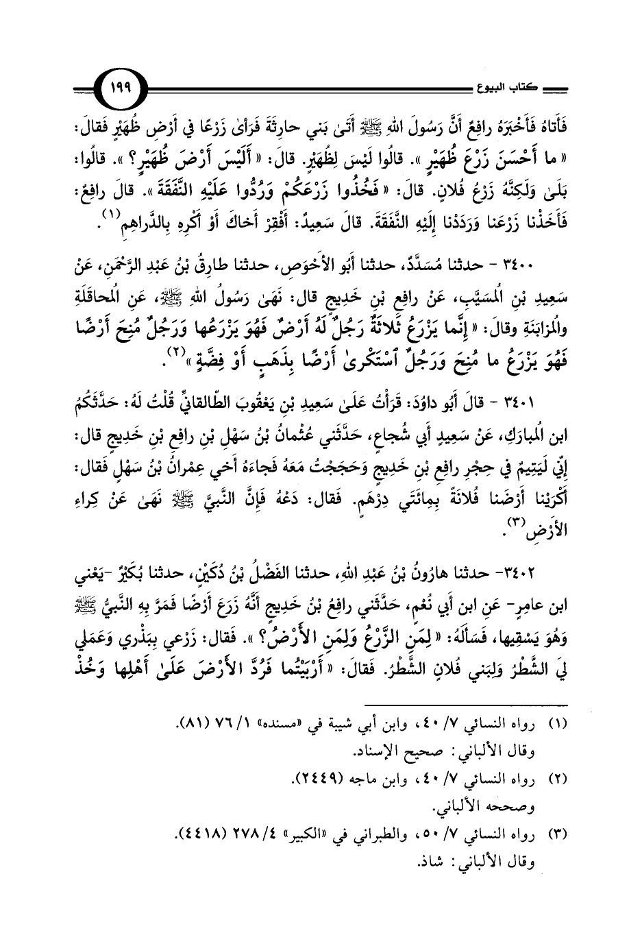 3400 - حدثنا مُسَدَّدٌ، حدثنا أَبُو الأَحْوَصِ، حدثنا طارِقُ بْنُ عَبْدِ الرَّحْمَنِ، عَنْ سَعِيدِ بْنِ المُسَيَّبِ، عَنْ رافِعِ بْنِ خَدِيجٍ قال: نَهَى رَسُولُ اللهِ - صلى الله عليه وسلم -، عَنِ المُحاقَلَةِ والمُزابَنَةِ وقالَ: "إِنَّما يَزْرَعُ ثَلاثَةٌ رَجُلٌ لَهُ أَرْضٌ فَهُوَ يَزْرَعُها وَرَجُلٌ مُنِحَ أَرْضًا فَهُوَ يَزْرَعُ ما مُنِحَ وَرَجُل اسْتَكْرى أَرْضًا بِذَهَبٍ أَوْ فِضَّةٍ" (¬2).
