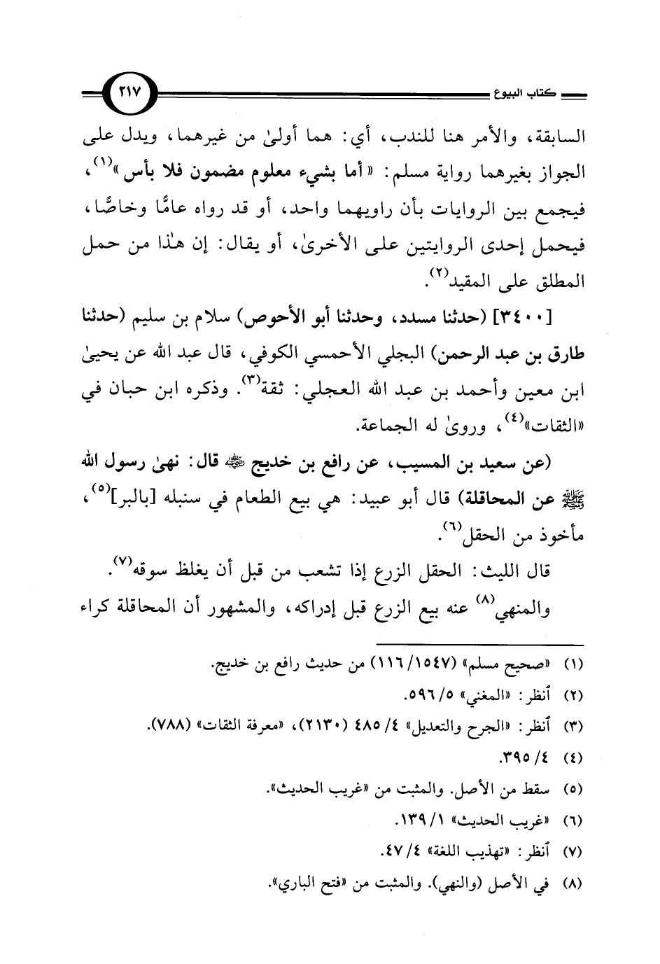 [3400] (حدثنا مسدد، وحدثنا أبو الأحوص) سلام بن سليم (حدثنا طارق بن عبد الرحمن) البجلي الأحمسي الكوفي، قال عبد الله عن يحيى ابن معين وأحمد بن عبد الله العجلي: ثقة (¬3). وذكره ابن حبان في "الثقات" (¬4)، وروى له الجماعة.
