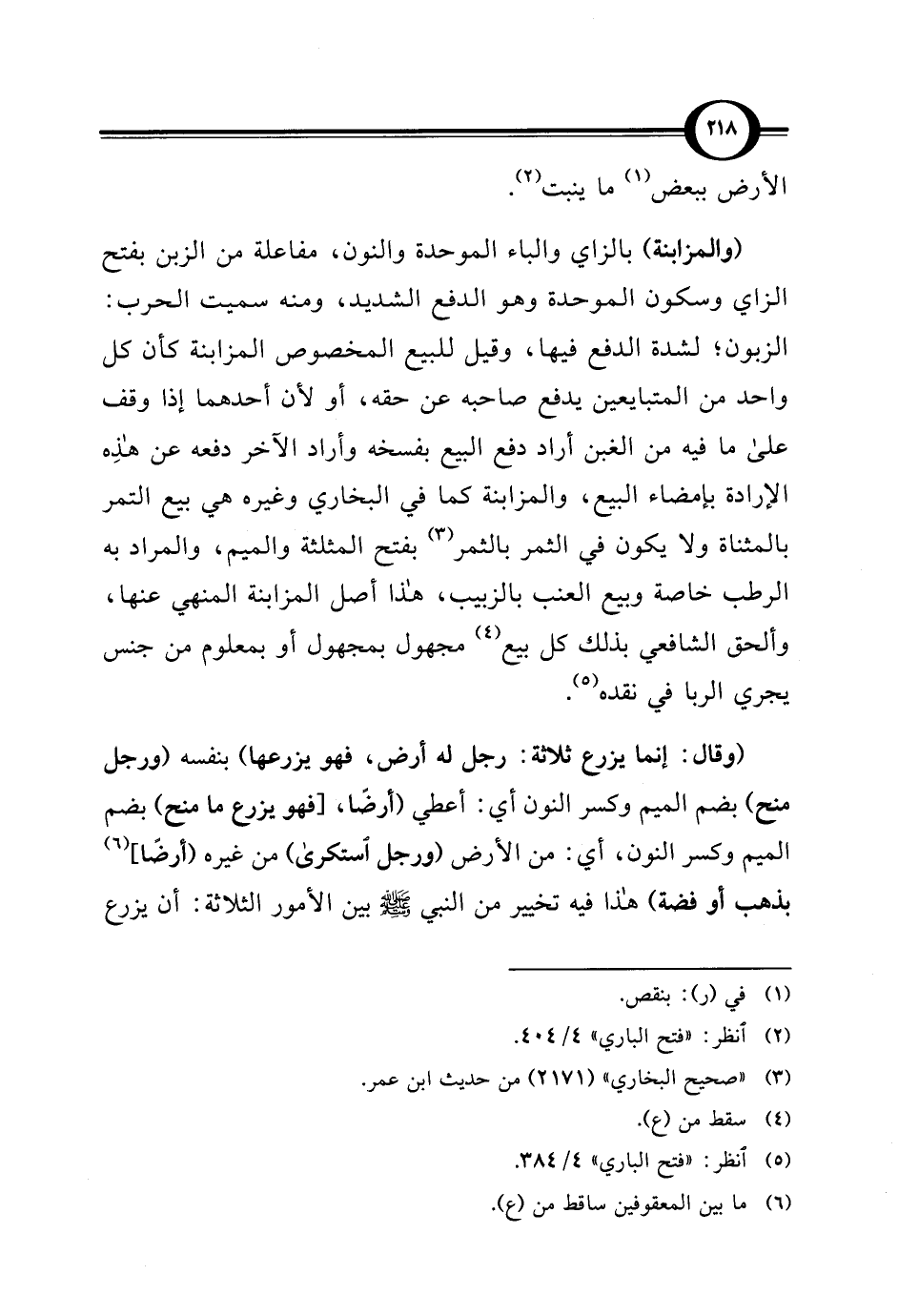 (والمزابنة) بالزاي والباء الموحدة والنون، مفاعلة من الزبن بفتح الزاي وسكون الموحدة وهو الدفع الشديد، ومنه سميت الحرب: الزبون؛ لشدة الدفع فيها، وقيل للبيع المخصوص المزابنة كان كل واحد من المتبايعين يدفع صاحبه عن حقه، أو لأن أحدهما إذا وقف على ما فيه من الغبن أراد دفع البيع بفسخه وأراد الآخر دفعه عن هذِه الإرادة بإمضاء البيع، والمزابنة كما في البخاري وغيره هي بيع التمر بالمثناة ولا يكون في الثمر بالثمر (¬3) بفتح المثلثة والميم، والمراد به الرطب خاصة وبيع العنب بالزبيب، هذا أصل المزابنة المنهي عنها، وألحق الشافعي بذلك كل بيع (¬4) مجهول بمجهول أو بمعلوم من جنس يجري الربا في نقده (¬5).