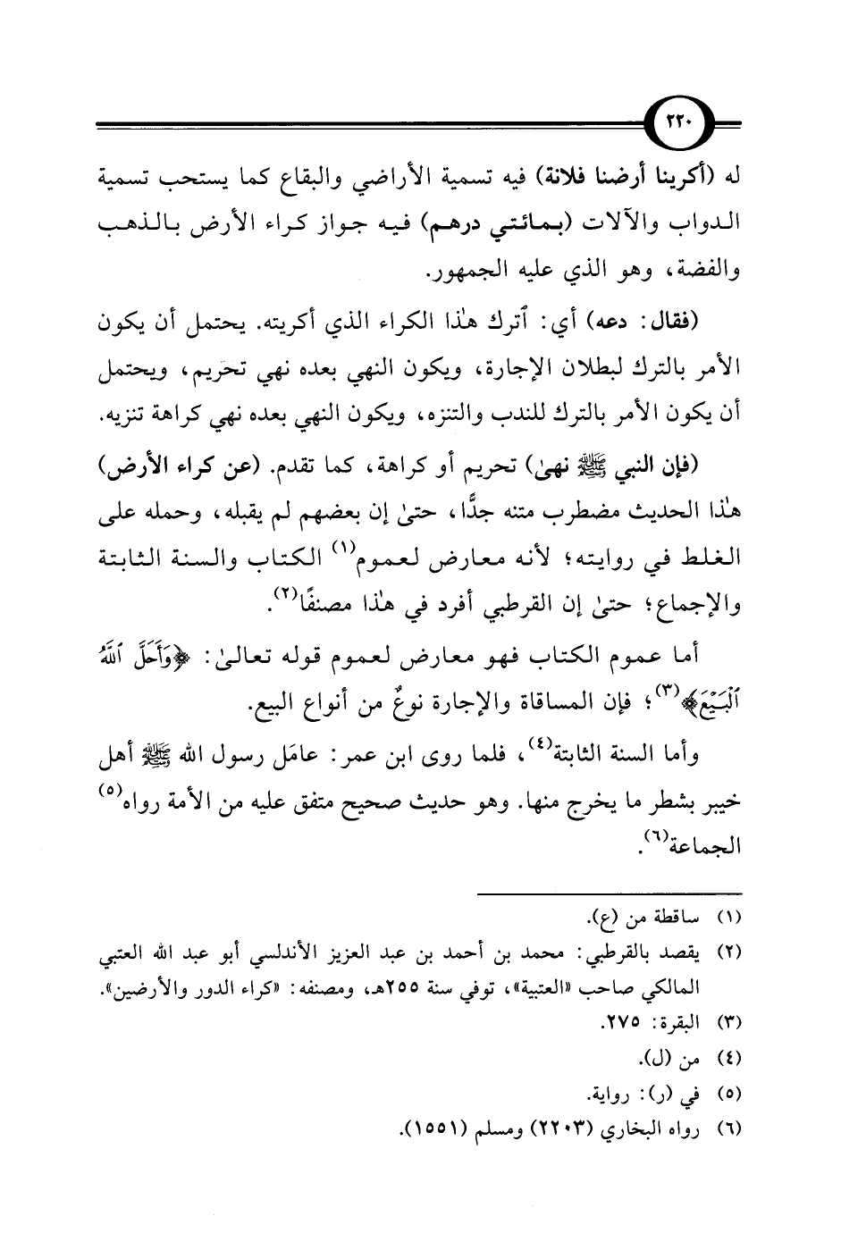 (¬2) يقصد بالقرطبي: محمد بن أحمد بن عبد العزيز الأندلسي أبو عبد الله العتبي المالكي صاحب "العتبية"، توفي سنة 255 هـ، ومصنفه: "كراء الدور والأرضين".