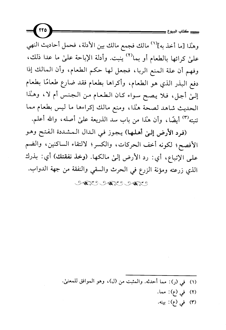 (فرد الأرض إلى أهلها) يجوز في الدال المشددة الفتح وهو الأفصح؛ لكونه أخف الحركات، والكسر؛ لالتقاء الساكنين، والضم على الإتباع، أي: رد الأرض إلى مالكها. (وخذ نفقتك) أي: بذرك الذي زرعته ومؤنة الزرع في الحرث والسقي والنفقة من جهة الدواب.
