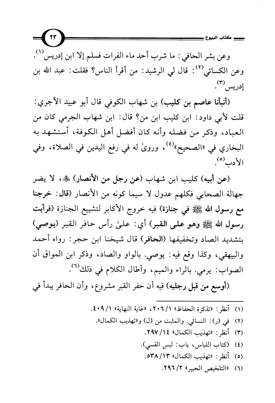 (عن أبيه) كليب ابن شهاب (عن رجل من الأنصار) -رضي الله عنهم -، لا يضر جهالة الصحابي فكلهم عدول لا سيما كونه من الأنصار (قال: خرجنا مع رسول الله - صلى الله عليه وسلم - في جنازة) فيه خروج الأكابر لتشييع الجنازة (فرأيت رسول الله - صلى الله عليه وسلم - وهو على القبر) أي: على رأس حافر القبر (يوصي) بتشديد الصاد وتخفيفها (الحافر) قال شيخنا ابن حجر: رواه أحمد والبيهقي، وكذا وقع فيه: يوصي. بالواو والصاد، وذكر ابن المواق أن الصواب: يرمي. بالراء والميم، وأطال الكلام في ذلك (¬6).