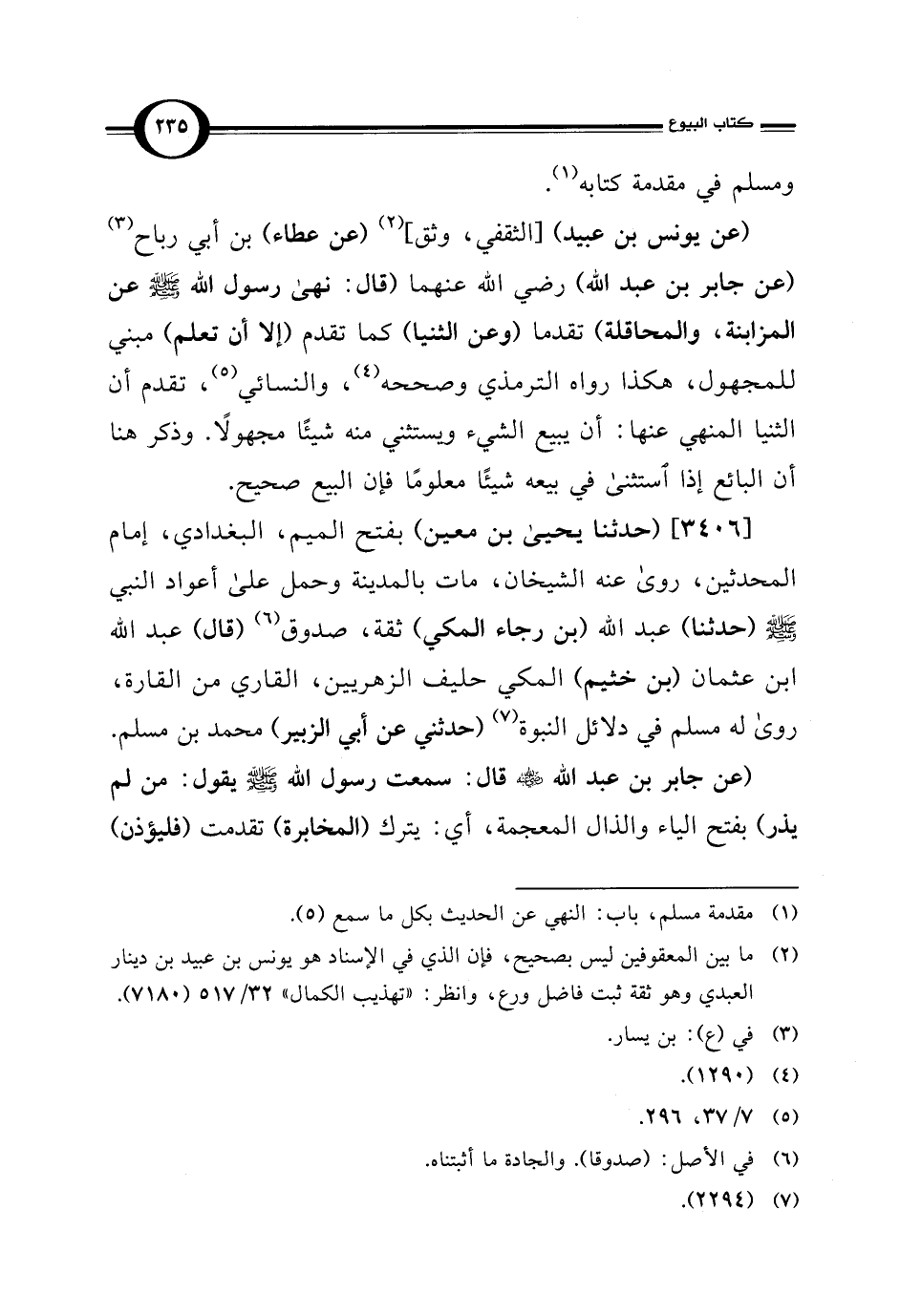 (عن يونس بن عبيد ([الثقفي، وثق] (¬2) (عن عطاء) بن أبي رباح (¬3) (عن جابر بن عبد الله) رضي الله عنهما (قال: نهى رسول الله - صلى الله عليه وسلم - عن المزابنة، والمحاقلة) تقدما (وعن الثنيا) كما تقدم (إلا أن تعلم) مبني للمجهول، هكذا رواه الترمذي وصححه (¬4)، والنسائي (¬5)، تقدم أن الثنيا المنهي عنها: أن يبيع الشيء ويستثني منه شيئًا مجهولًا. وذكر هنا أن البائع إذا استثنى في بيعه شيئًا معلومًا فإن البيع صحيح.