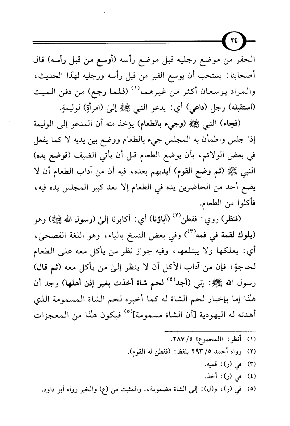 (فنظر) روي: ففطن (¬2) (آباؤنا) أي: أكابرنا إلى (رسول الله - صلى الله عليه وسلم -) وهو (يلوك لقمة في فمه) (¬3) وفي بعض النسخ بالياء، وهو اللغة الفصحى، أي: يعلكها ولا يبتلعها، وفيه جواز نظر من يأكل معه على الطعام لحاجةٍ؛ فإن من آداب الأكل أن لا ينظر إلى من يأكل معه (ثم قال (رسول الله - صلى الله عليه وسلم -: إني (أجد (¬4) لحم شاة أخذت بغير إذن أهلها) وجد أن هذا إما بإخبار لحم الشاة له كما أخبره لحم الشاة المسمومة الذي أهدته له اليهودية [أن الشاة مسمومة] (¬5) فيكون هذا من المعجزات