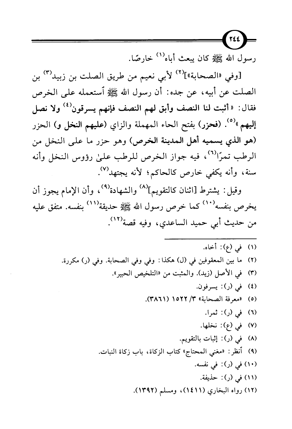[وفي "الصحابة"] (¬2) لأبي نعيم من طريق الصلت بن زبيد (¬3) بن الصلت عن أبيه، عن جده: أن رسول الله - صلى الله عليه وسلم - استعمله على الخرص فقال: "أثبت لنا النصف وأبق لهم النصف فإنهم يسرقون (¬4) ولا نصل إليهم" (¬5). (فحزر) بفتح الحاء المهملة والزاي (عليهم النخل و) الحزر (هو الذي يسميه أهل المدينة الخرص) وهو حزر ما على النخل من الرطب تمرًا (¬6)، فيه جواز الخرص للرطب على رؤوس النخل وأنه سنة، وأنه يكفي خارص كالحاكم؛ لأنه يجتهد (¬7).