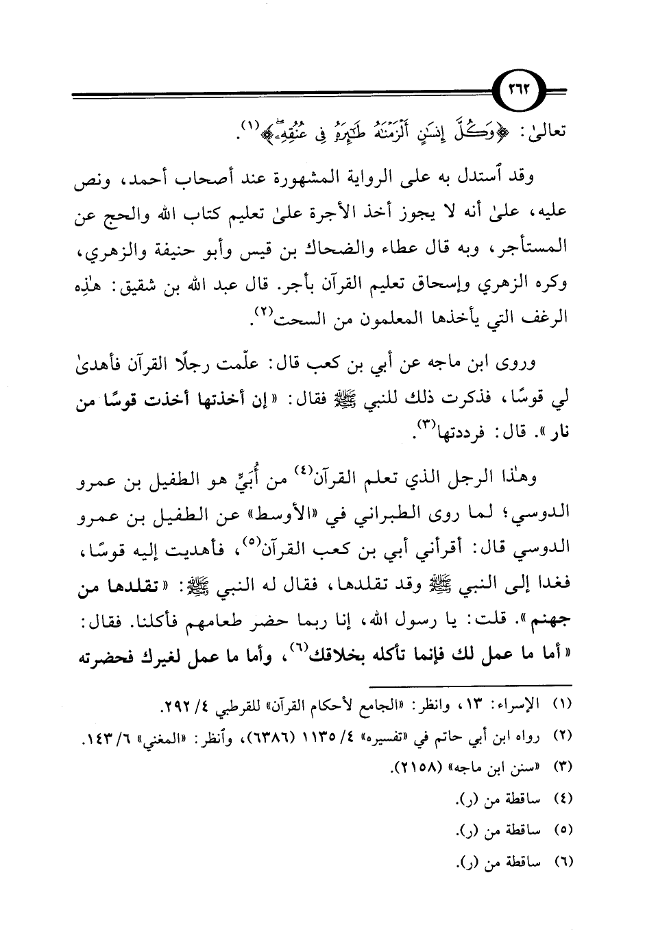 وروى ابن ماجة عن أبي بن كعب قال: علّمت رجلًا القرآن فأهدى لي قوسًا، فذكرت ذلك للنبي - صلى الله عليه وسلم - فقال: "إن أخذتها أخذت قوسًا من نار". قال: فرددتها (¬3).