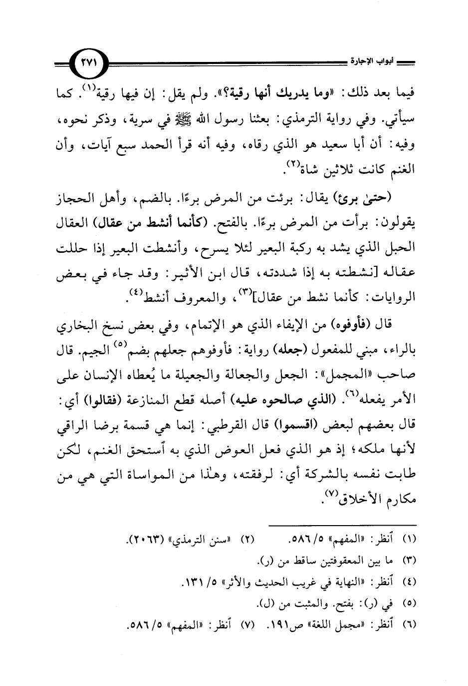 قال (فأوفوه) من الإيفاء الذي هو الإتمام، وفي بعض نسخ البخاري بالراء، مبني للمفعول (جعله) رواية: فأوفوهم جعلهم بضم (¬5) الجيم. قال صاحب "المجمل": الجعل والجعالة والجعيلة ما يُعطاه الإنسان على الأمر يفعله (¬6). (الذي صالحوه عليه) أصله قطع المنازعة (فقالوا) أي: قال بعضهم لبعض (اقسموا) قال القرطبي: إنما هي قسمة برضا الراقي لأنها ملكه؛ إذ هو الذي فعل العوض الذي به استحق الغنم، لكن طابت نفسه بالشركة أي: لرفقته، وهذا من المواساة التي هي من مكارم الأخلاق (¬7).