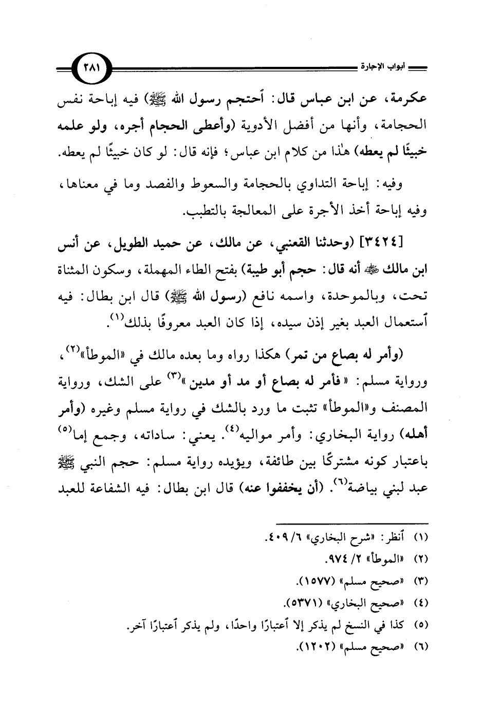 [3424] (وحدثنا القعنبي، عن مالك، عن حميد الطويل، عن أنس ابن مالك -رضي الله عنه- أنه قال: حجم أبو طيبة) بفتح الطاء المهملة، وسكون المثناة تحت، وبالموحدة، واسمه نافع (رسول الله - صلى الله عليه وسلم -) قال ابن بطال: فيه استعمال العبد بغير إذن سيده، إذا كان العبد معروفًا بذلك (¬1).